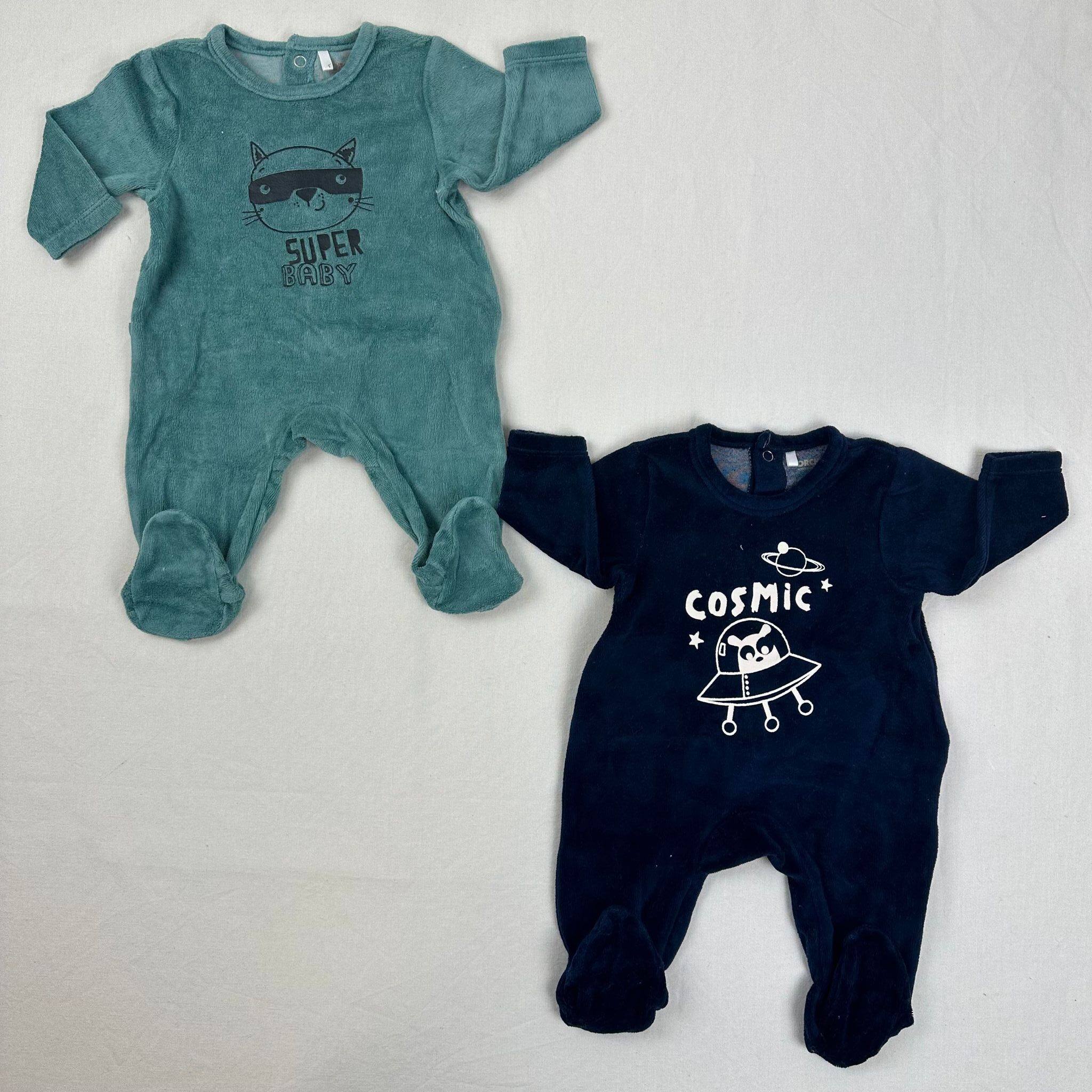 Autres commentaires : 2 pyjamas une piéce manches longues avec motif centrale « Cosmic et Super baby » et une fermeture au dos par boutons pressions.