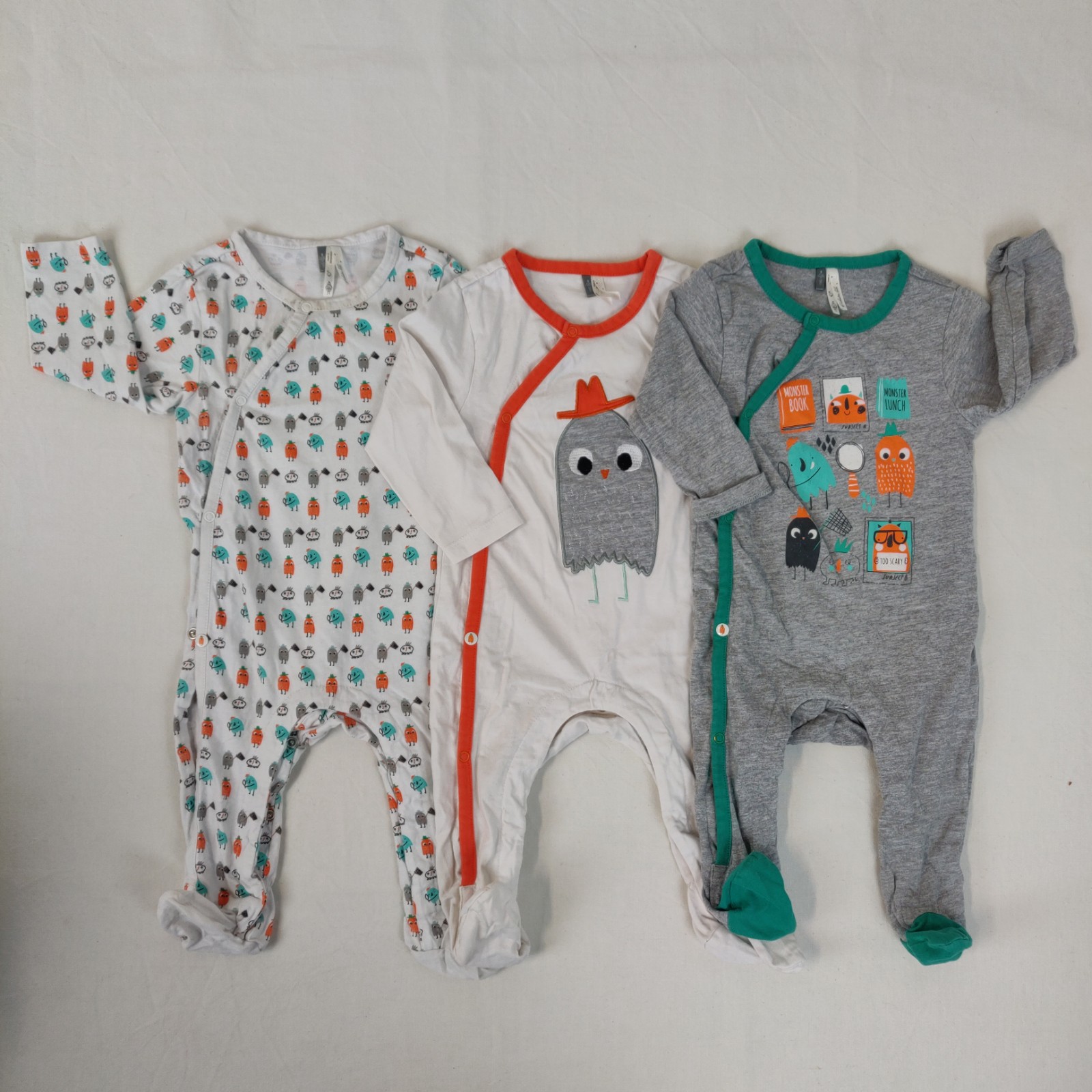 Autres commentaires : 2 Pyjamas manches longues orange et vert avec un Body gris offert.