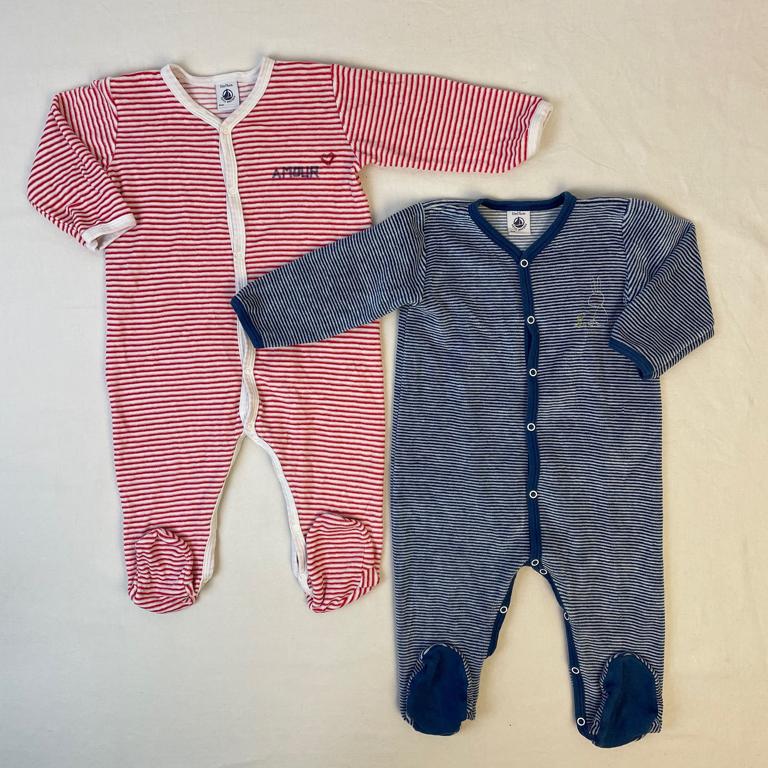 - Lots de 2 pyjamas en velours Petit Bateau, un blanc à rayures rouge (avec l’inscription AMOUR écrite à la main) et l’autre blanc à rayures bleu.