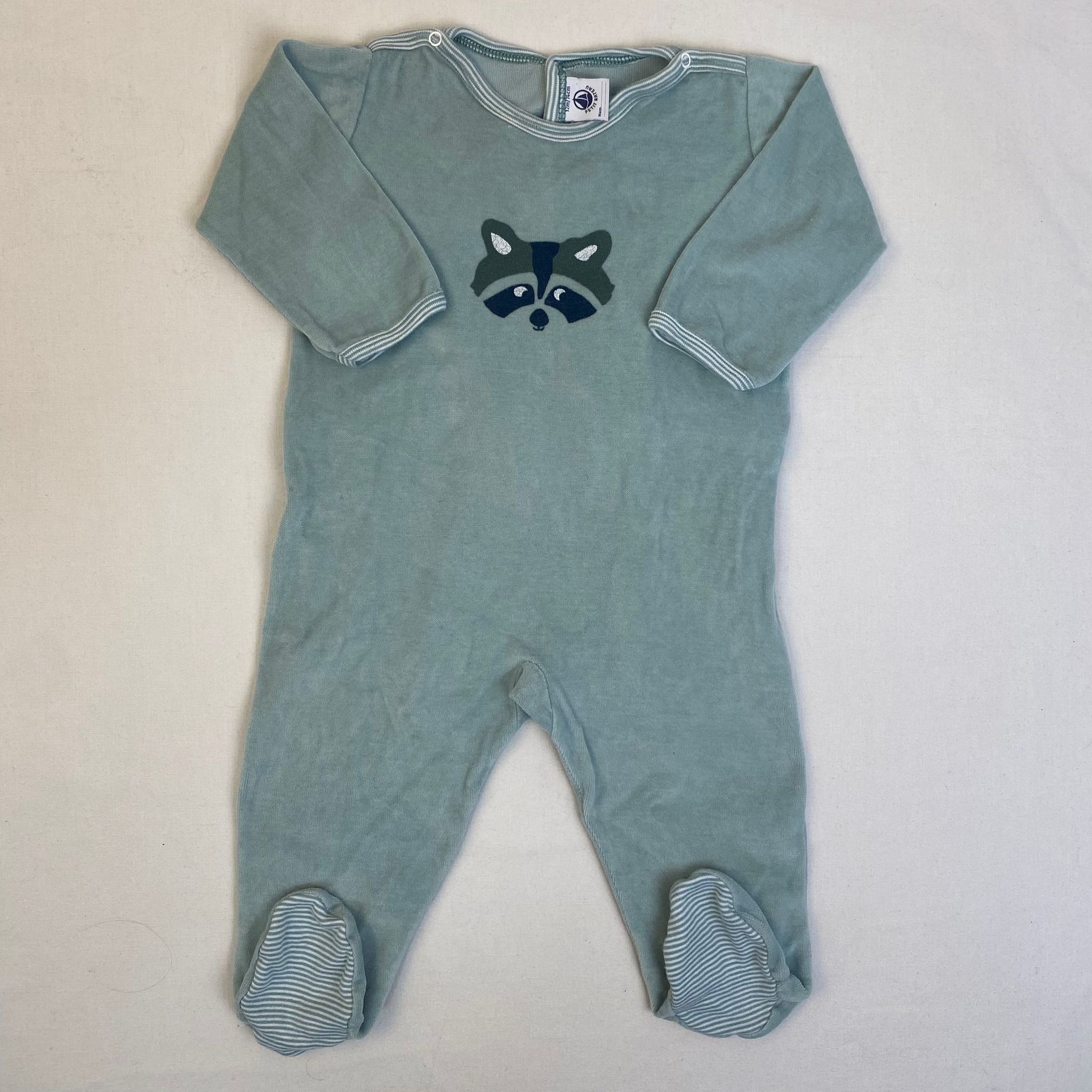 Pyjama une pièce dors-bien en velours vert clair, fermeture par boutons pression aux épaules et au dos, devant motif de tête de raton laveur.
