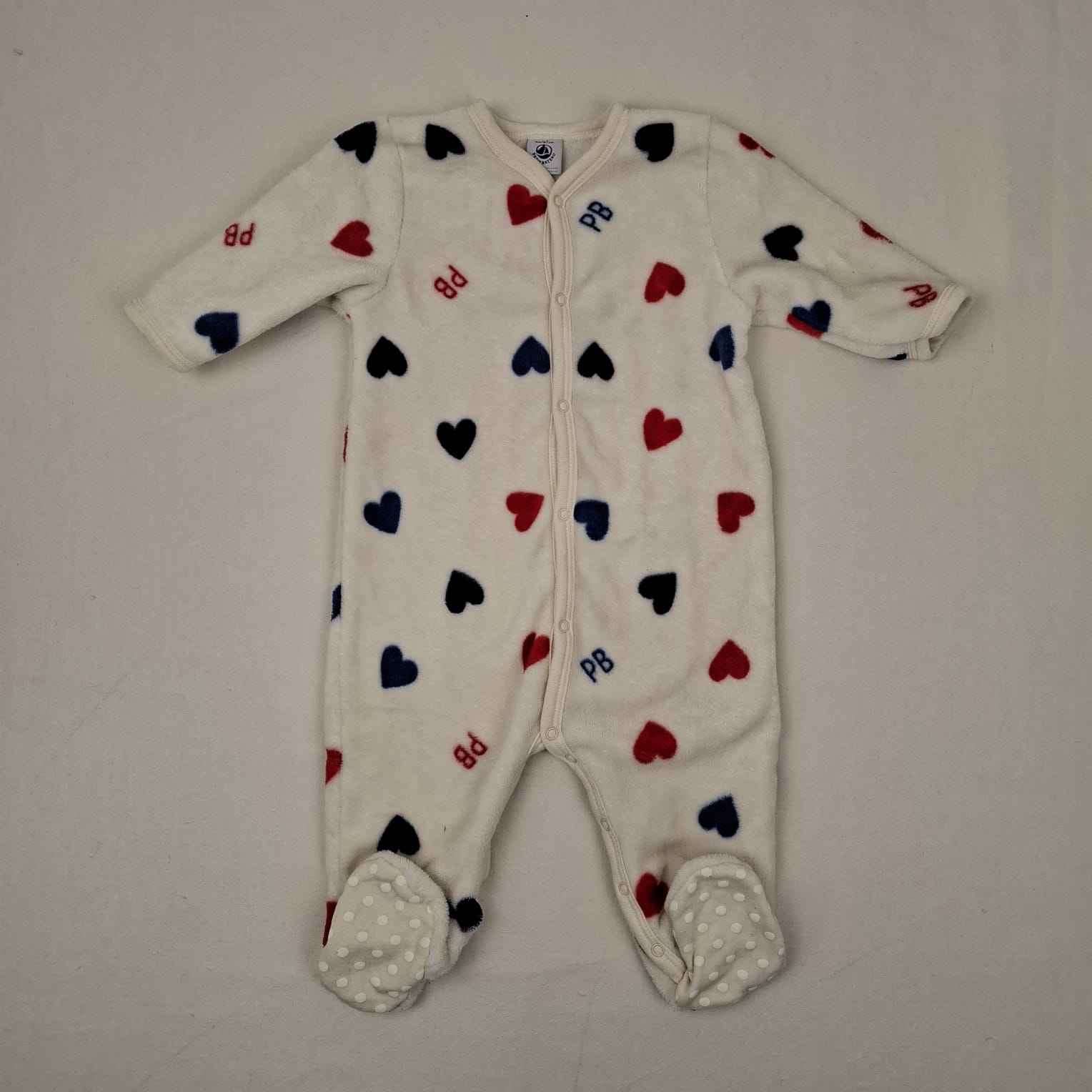 Autres commentaires : Surpyjama en polaire, matière chaude et douce, motif coeurs bleus et rouges, ouverture boutons-pression sur le devant et à l’entrejambe, col V.