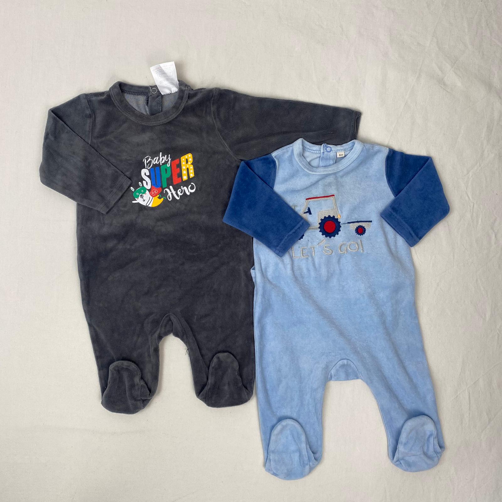 Autres commentaires : 25% polyester. Lot 2 pyjamas dors-bien en velours, fermeture au dos par boutons pression : – un TEX bleu clair avec manches bleu foncé, devant motif tracteur avec l’inscription « Let’s go! », – un gris foncé sans marque, devant motif animal masqué avec inscription « Baby Super hero ».