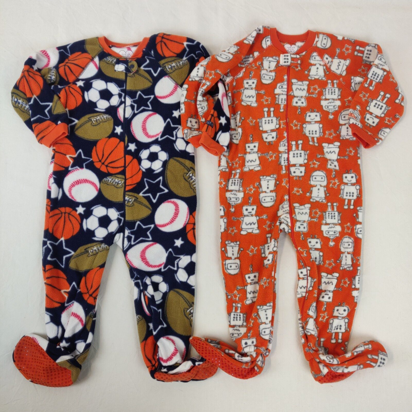Autres commentaires : Lot de 2 pyjamas 1 pièce à manches longues et à pieds en polaire. Semelles antidérapantes. Ouverture centrale zippée. Un pyjama orange avec des motifs petits robots blancs et gris. Un pyjama bleu marine avec motifs divers ballons de sport. Col et poignets façon tricot élastique orange. Usure normale des vêtements.