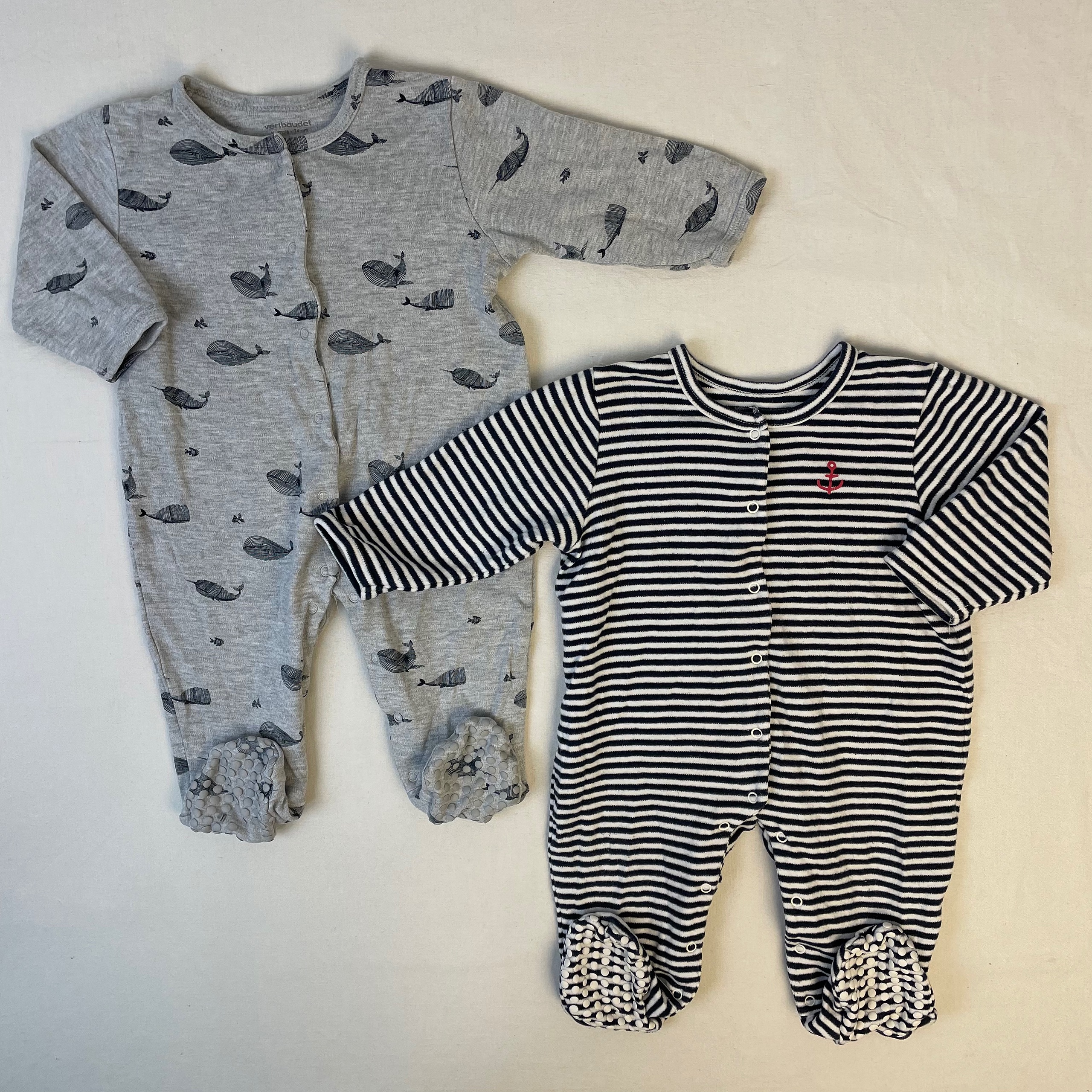 - Lot de 2 pyjamas en jersey épais : l’un avec des motifs baleines, l’autre marin avec un motif ancre.