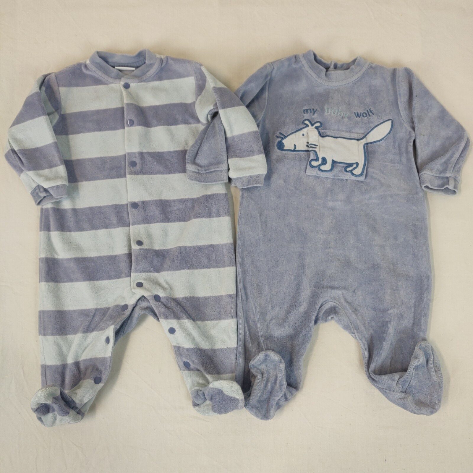 Autres commentaires : 25% polyester. Lot de 2 pyjamas DORS-BIEN à manches longues et à pieds. Un pyjama bleu-gris avec motif central en relief petit loup blanc accompagné de l’inscription « My baby wolf ». Ouverture pressionnée au dos. Un pyjama bleu clair rayé bleu-gris. Ouverture pressionnée au devant. Très léger accro à l’arrière.