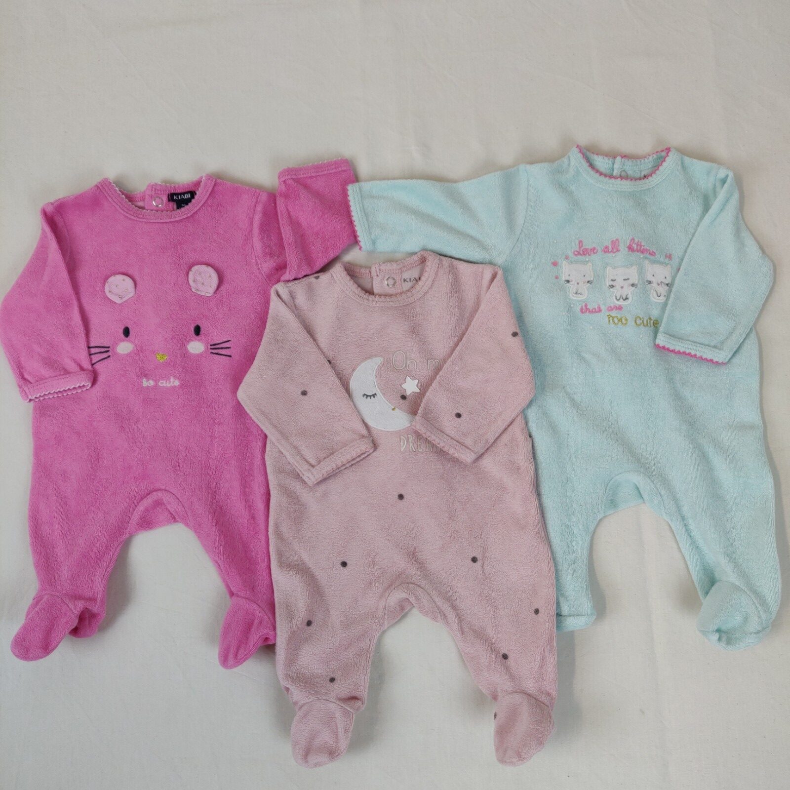 Autres commentaires : 23% polyester. Lot de 3 pyjamas 1 pièce DORS-BIEN à manches longues et à pieds en velours. Ouverture pressionnée au dos. Un pyjama bleu-vert. Motifs centraux piqués 3 petits chatons accompagnés de l’inscription « Love all kittens that are too cute ». Un pyjama rose avec motif central visage de petit chat avec les oreilles en relief accompagné de l’inscription « So cute ». Un pyjama rose clair à pois gris foncé avec motif piqué lune accompagné de l’inscription « Oh my little dreamer ».