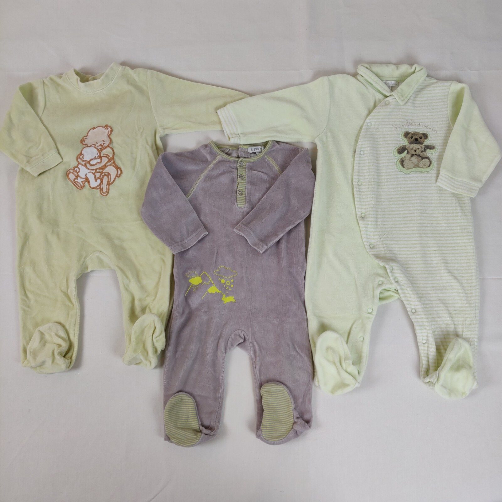 Autres commentaires : 24% polyester. Lot de 3 pyjamas 1 pièce à manches longues et à pieds en matière velours. 1 pyjama DORS-BIEN « In Extenso » marron glacé avec motif latéral jaune lapin gambadant dans la montagne. Ouverture centrale à 3 boutons classiques. Ouverture pressionnée au dos. Très légères traces d’usure. 1 pyjama DORS-BIEN « La Redoute » jaune avec motifs centraux oursons marrons se câlinant. Ouverture pressionnée au dos. 1 pyjama « Kitchoun » jaune-vert et une partie écrue à rayures jaune-vert avec motifs centraux marrons oursons en peluche et inscription « Mon bébé d’amour ». Ouverture centrale et à l’entre-jambe à boutons pression.
