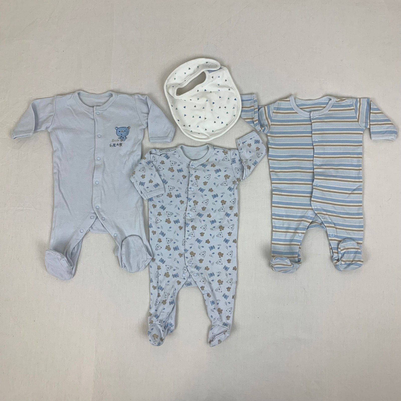 Autres commentaires : Lot de 3 pyjamas bleu une piéce manches longues avec fermeture centrale par bouton pression. Bavoir blanc offert.