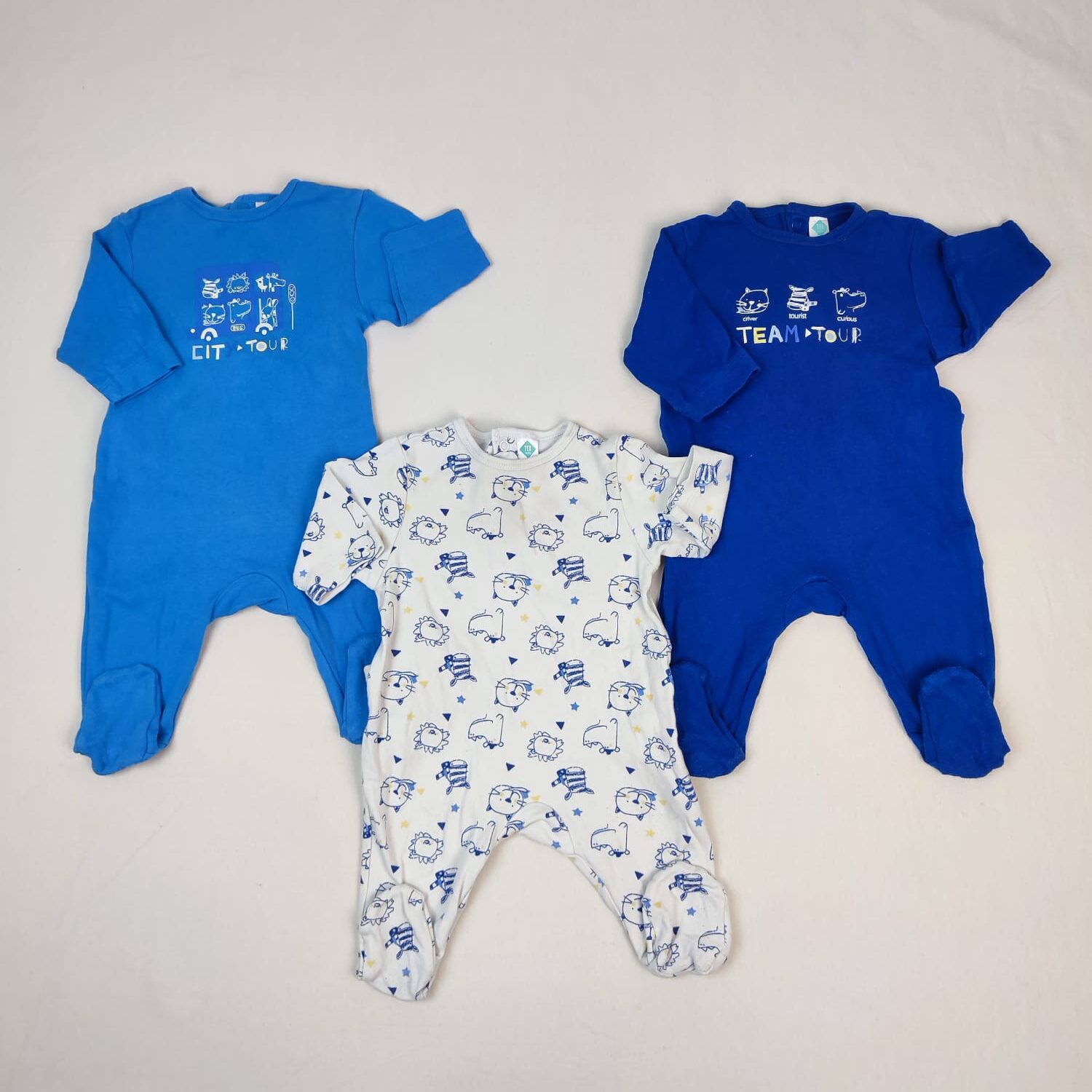 Autres commentaires : Lot de 3 pyjamas dors-bien en jersey de coton, fermeture par boutons pression au dos : – 1 blanc, motif animaux en bleu foncé – 1 bleu foncé, motifs animaux en blanc avec inscription « Driver, tourist, curious, TEAM TOUR », 1 bleu moyen, motifs animaux dans un bus avec inscription « CITY TOUR » devant. très Fines bouloches au niveau des jambes