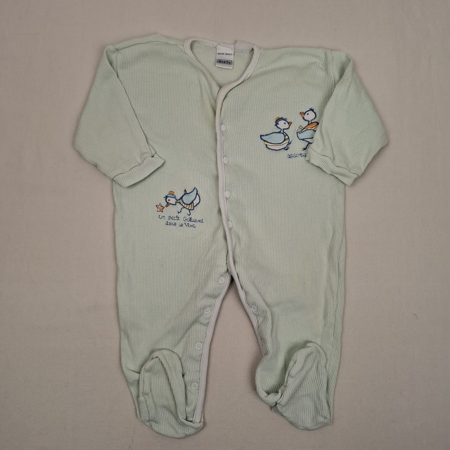 Autres commentaires : Pyjama vert d’eau à manches longues, motif canetons et inscription « Un petit goéland dans le vent », fermeture par boutons pression devant, col V. Petit défaut : quelques taches devant. Niveau réduit de Fraise à Myrtille.