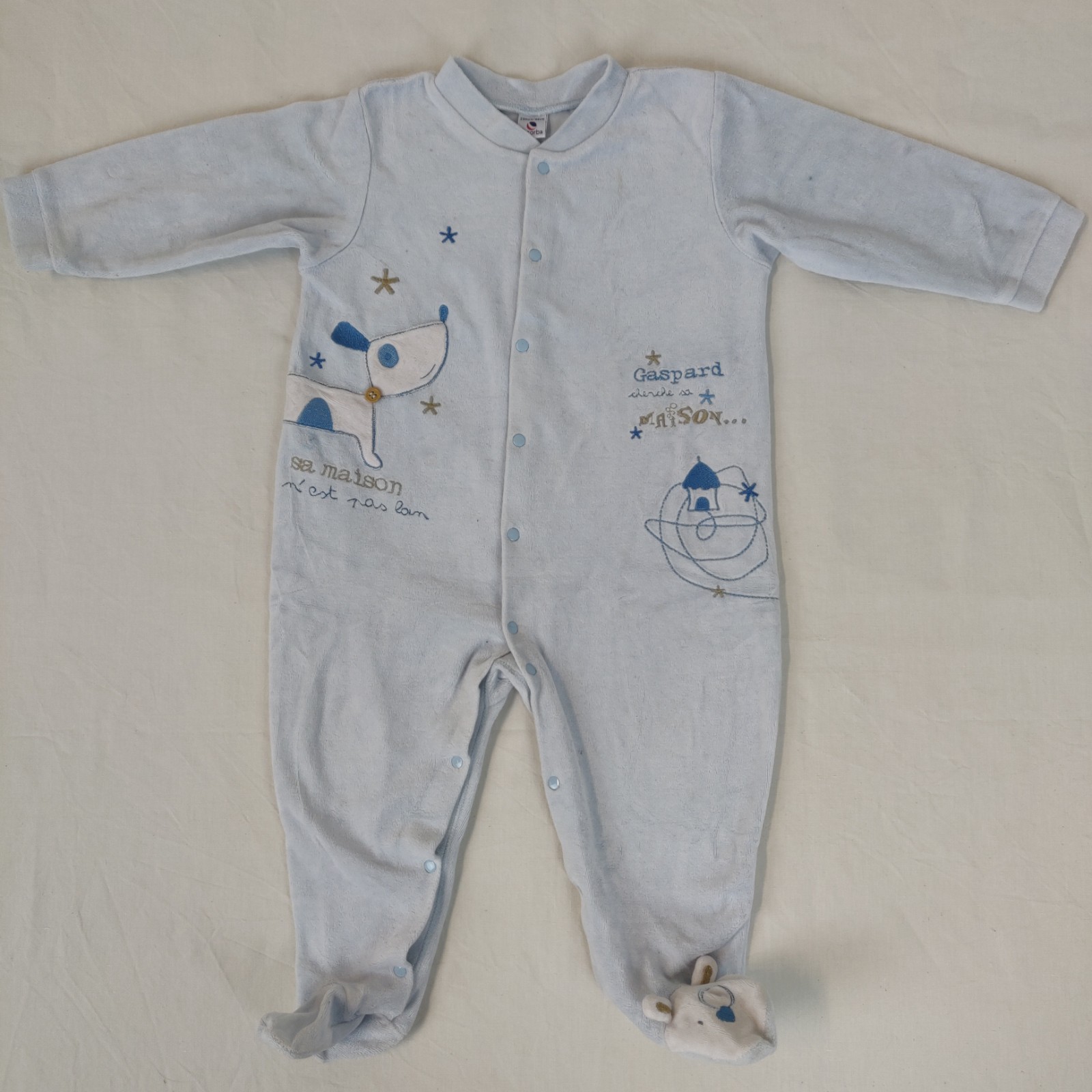 Autres commentaires : 23% polyester. Pyjama 1 pièce DORS-BIEN à manches longues et à pieds. Motifs centraux piqués petit chien cherchant sa niche accompagnés de l’inscription « Gaspard cherche sa maison. Sa maison n’est pas loin. » Ouveture pressionnée au devant. Légères tâches marrons sur le devant. Niveau réduit de fraise à myrtille.