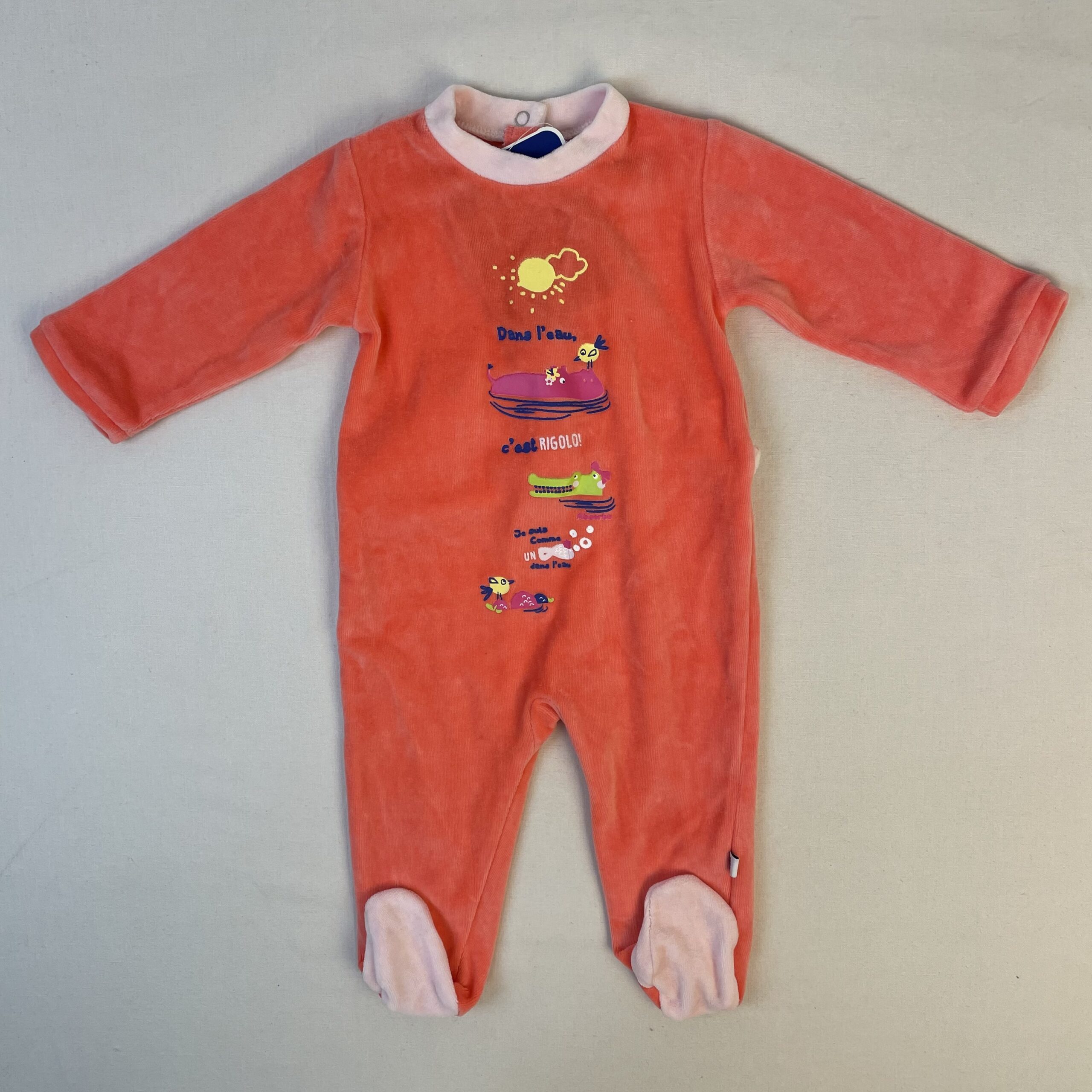 - Pyjama en velours avec pieds, couleur pêche, fermeture par boutons pressions au dos, motif les animaux et inscription « Dans l’eau, c’est rigolo! »