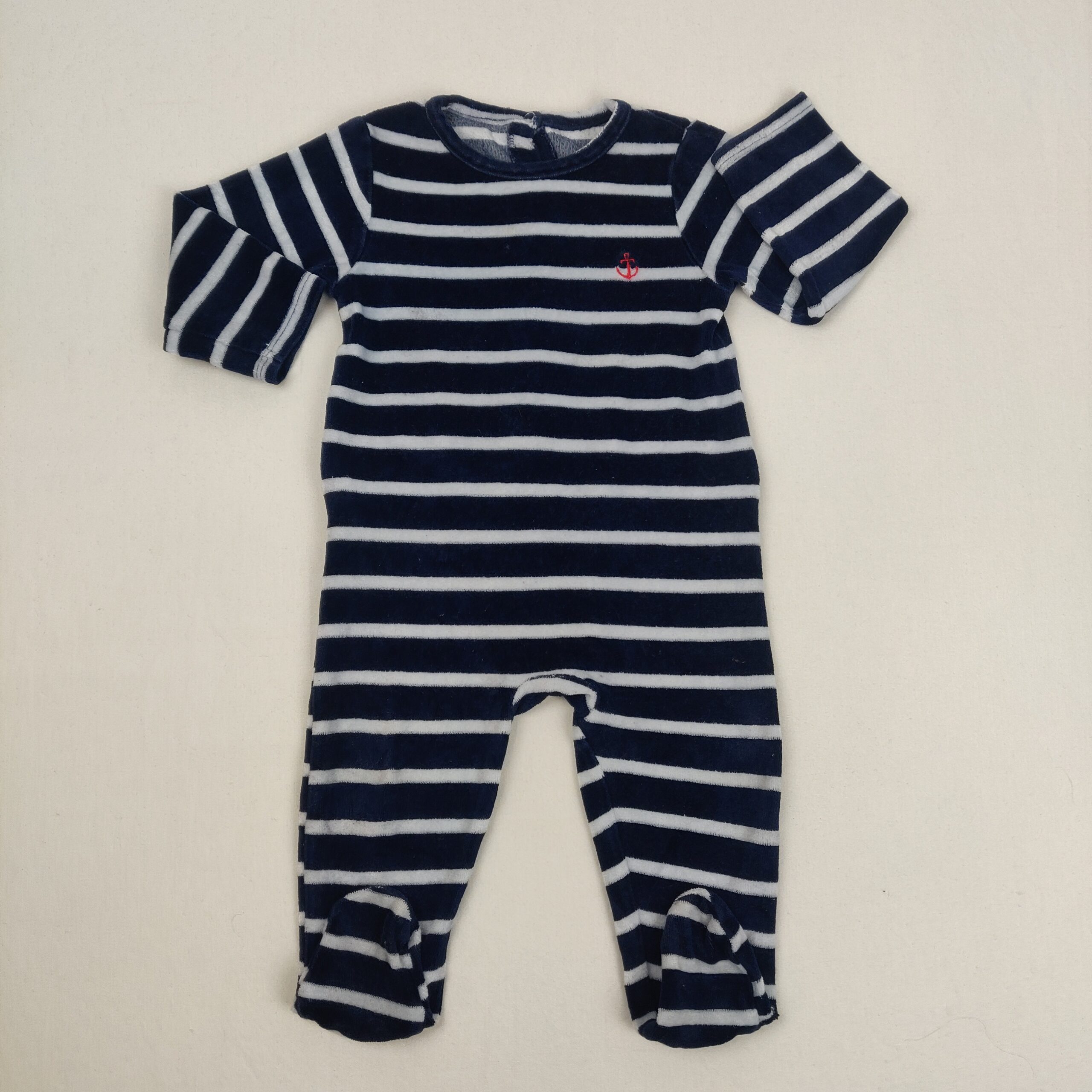 Autres commentaires : Pyjama dors-bien, en velours, col rond, à rayures, avec pieds, fermeture par boutons à l’arrière.