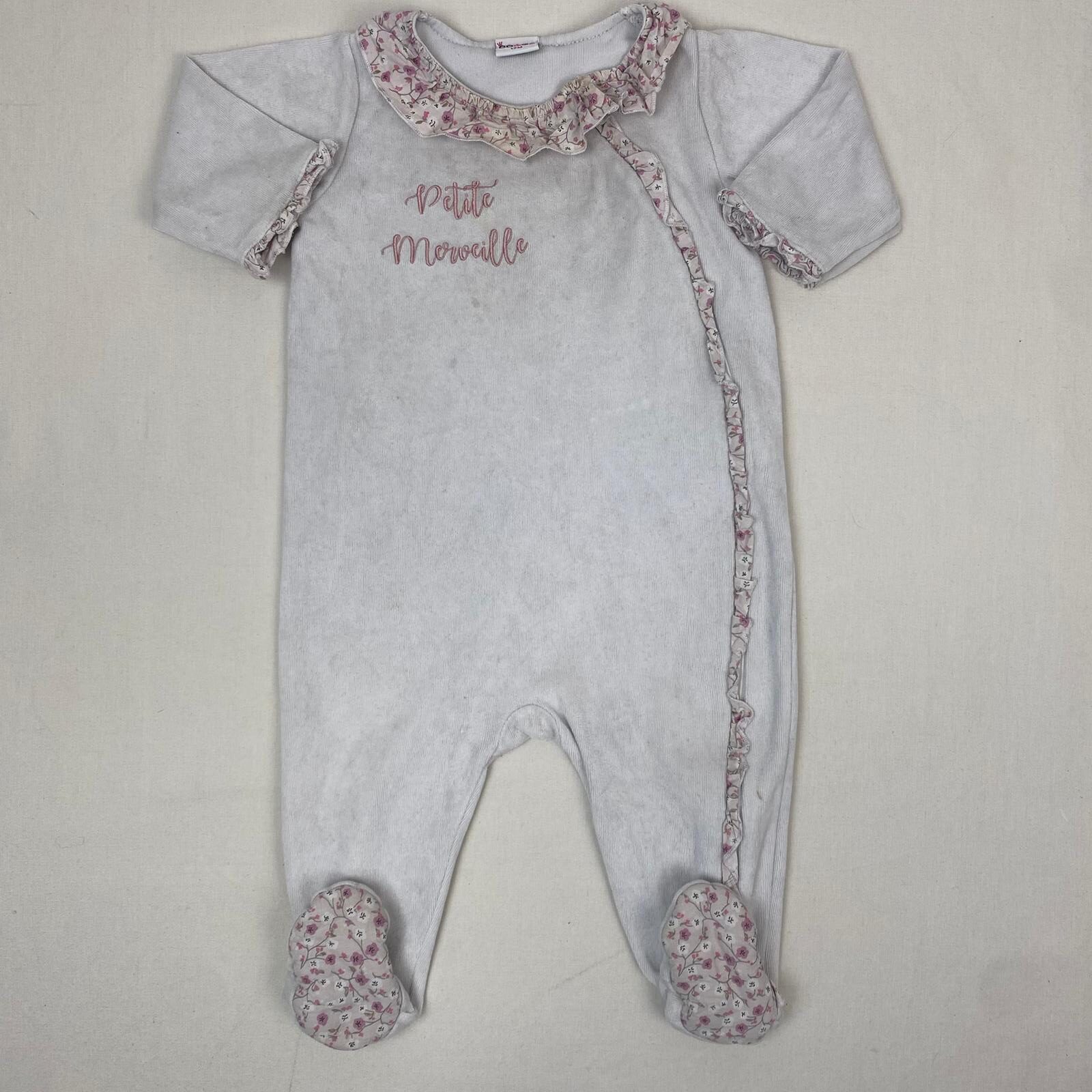 Autres commentaires : Pyjama dors-bien en velours couleur blanc mastic, col collerette, bordures volantées et dessous de pieds en tissu fleuri rose, devant inscription « Petite merveille » en écriture cursive rose, fermeture complète devant par zip.