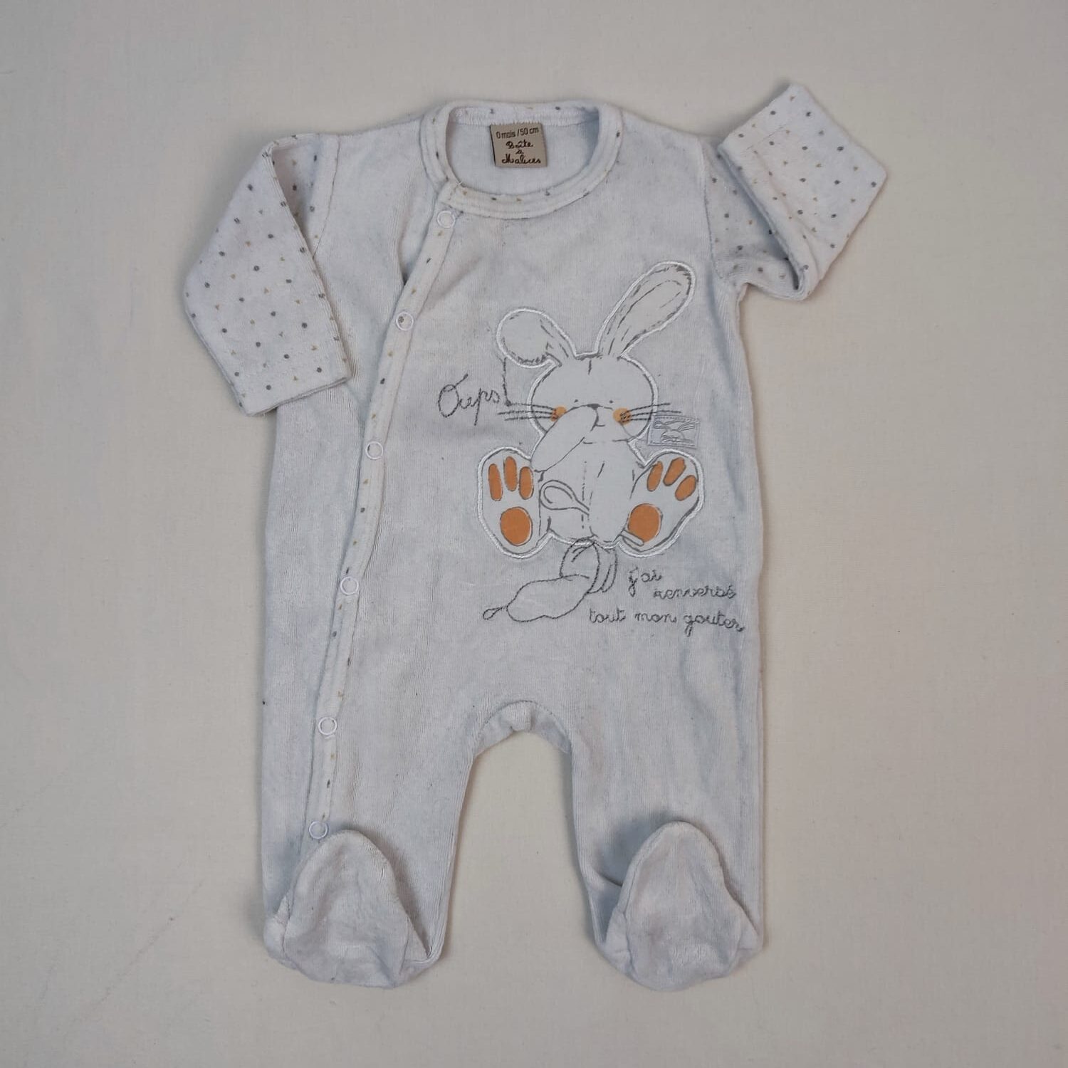 Autres commentaires : 25% Polyester – Pyjama dors-bien en velours blanc, avec pieds motif lapin devant et petits pois gris et beige sur les manches et inscription « Oups j’ai renversé tout mon goûter », col rond, fermeture devant par boutons pression.