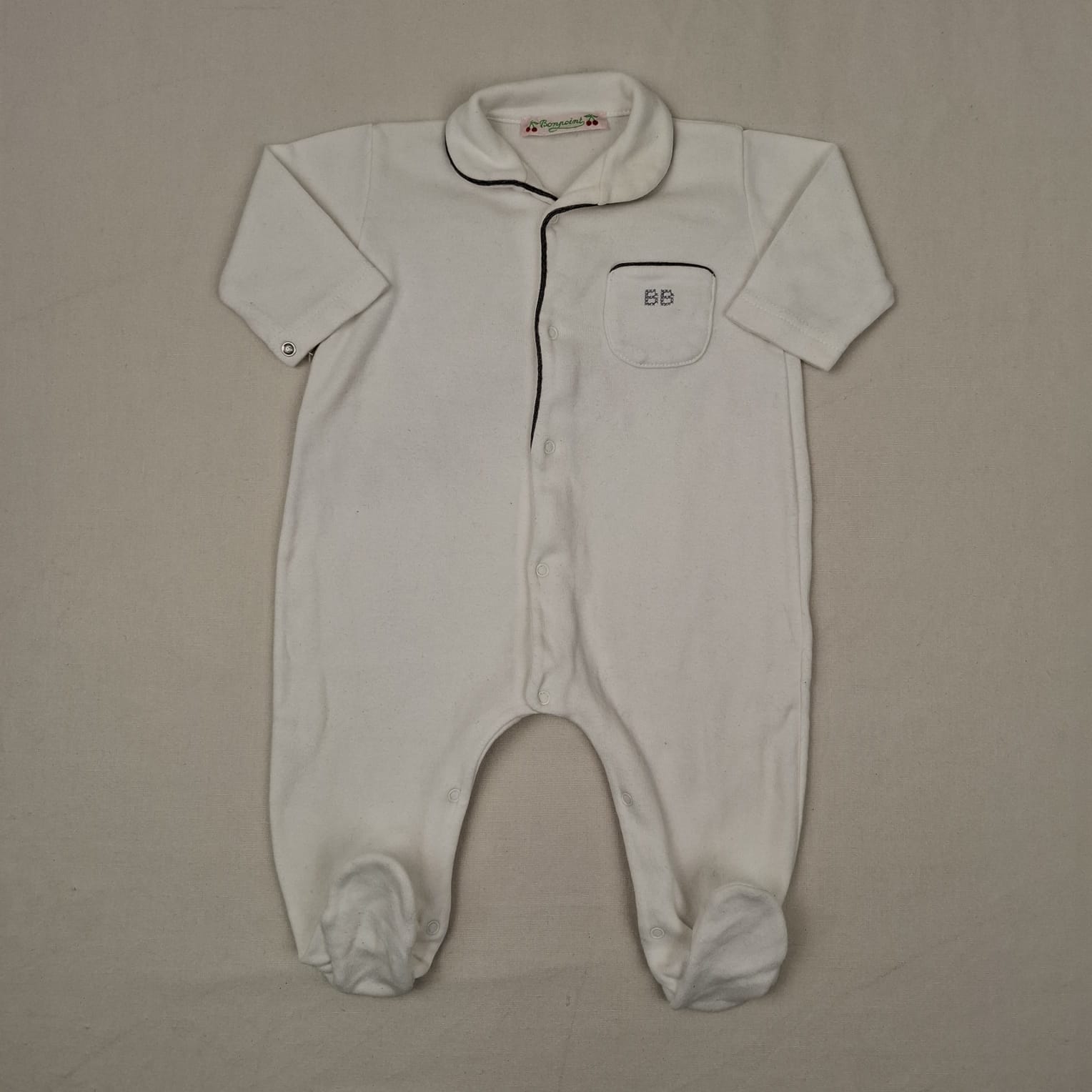 Autres commentaires : Pyjama blanc uni, col club, fermeture par boutons pression, effet usé.