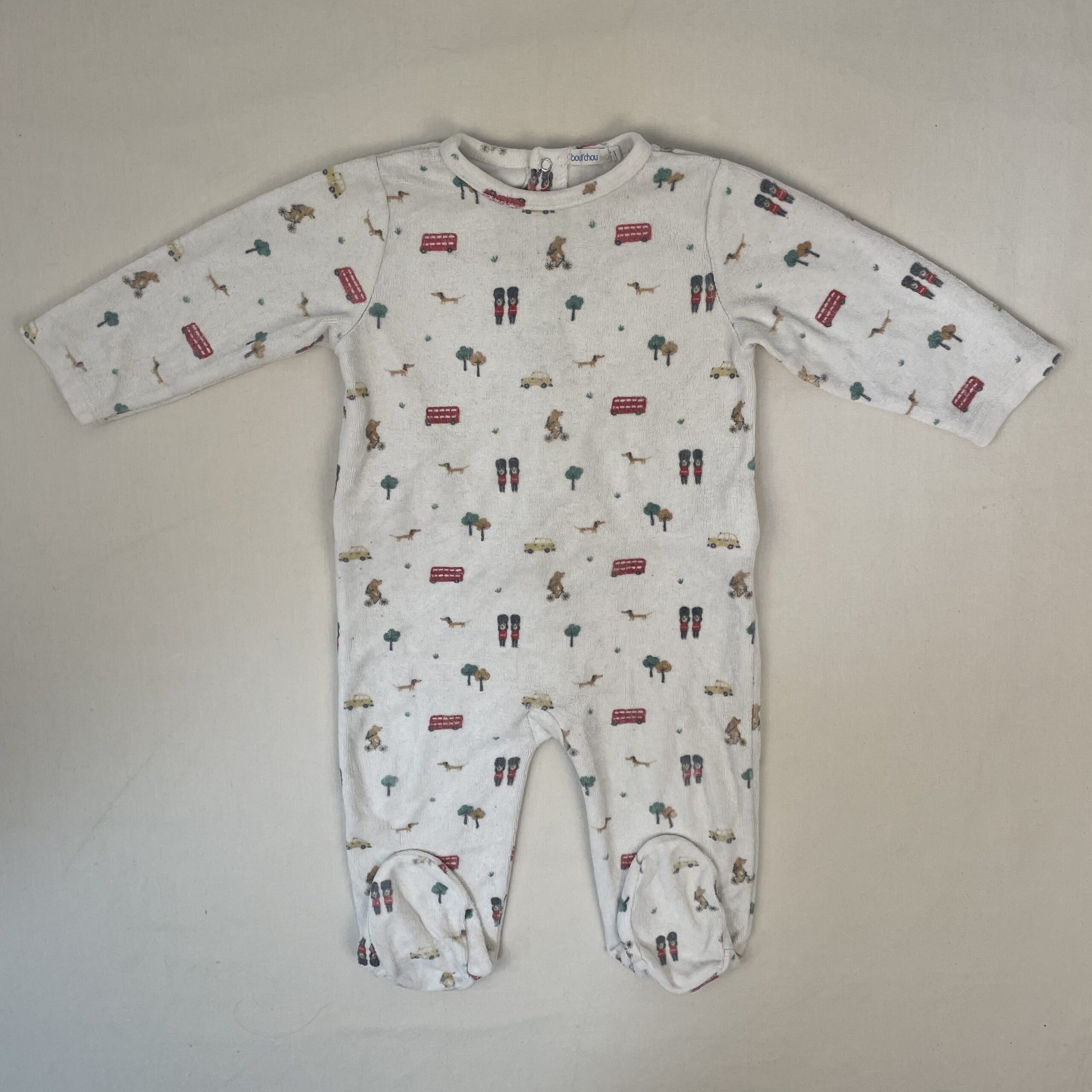 - Pyjama en velours avec pieds, fermeture par boutons pression au dos, motif anglais.