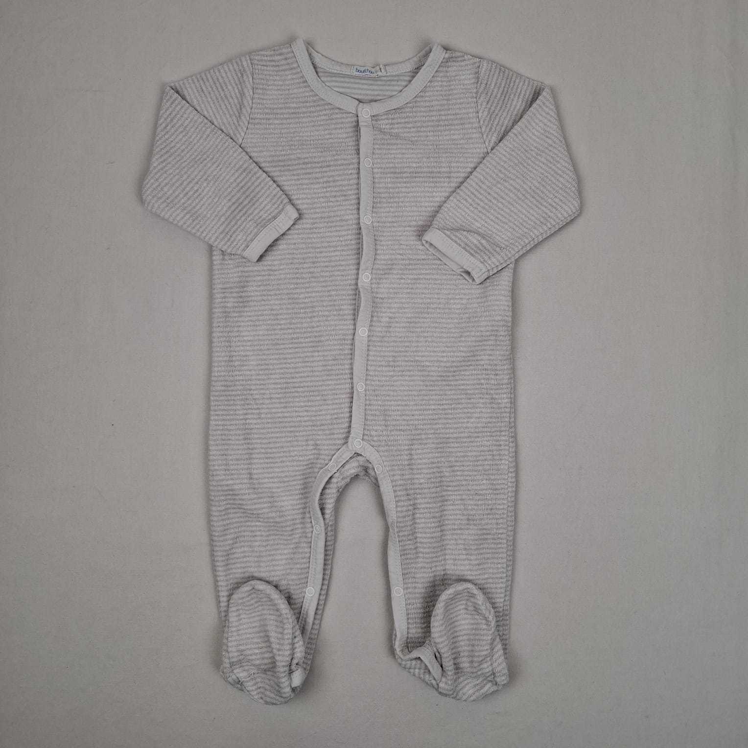 Autres commentaires : Pyjama 1 pièce Bout’chou 12M rayé beige et blanc fer meture boutons pressions à l’avant pieds intégrés