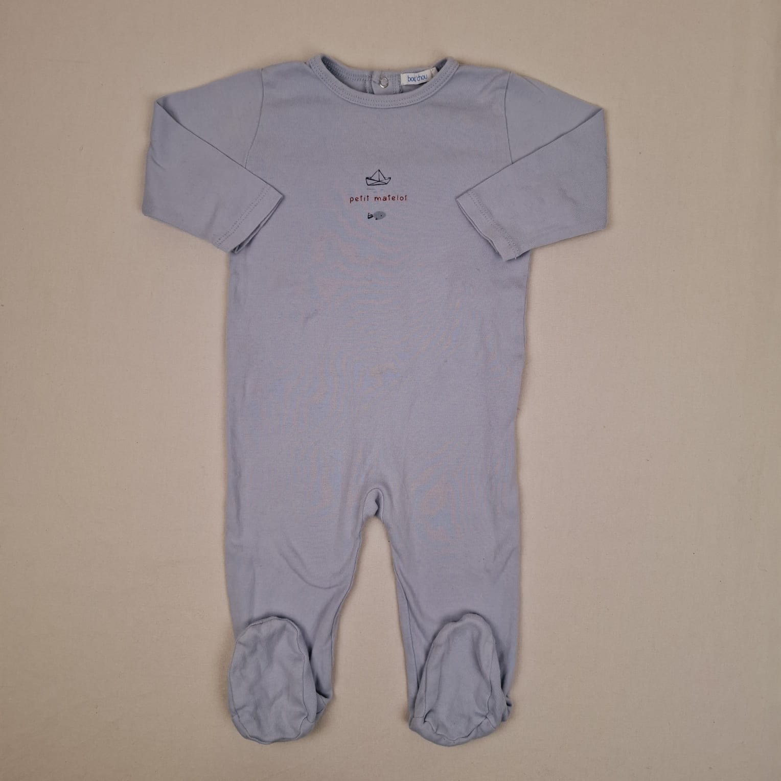 Autres commentaires : Pyjama 1 pièce bleu clair, 12 mois, bout’chou, inscription « petit matelot » avec une illustration d’un bateau en papier avec un poisson, ouverture du pyjama avec des boutons pressions à l’arrière du pyjama.