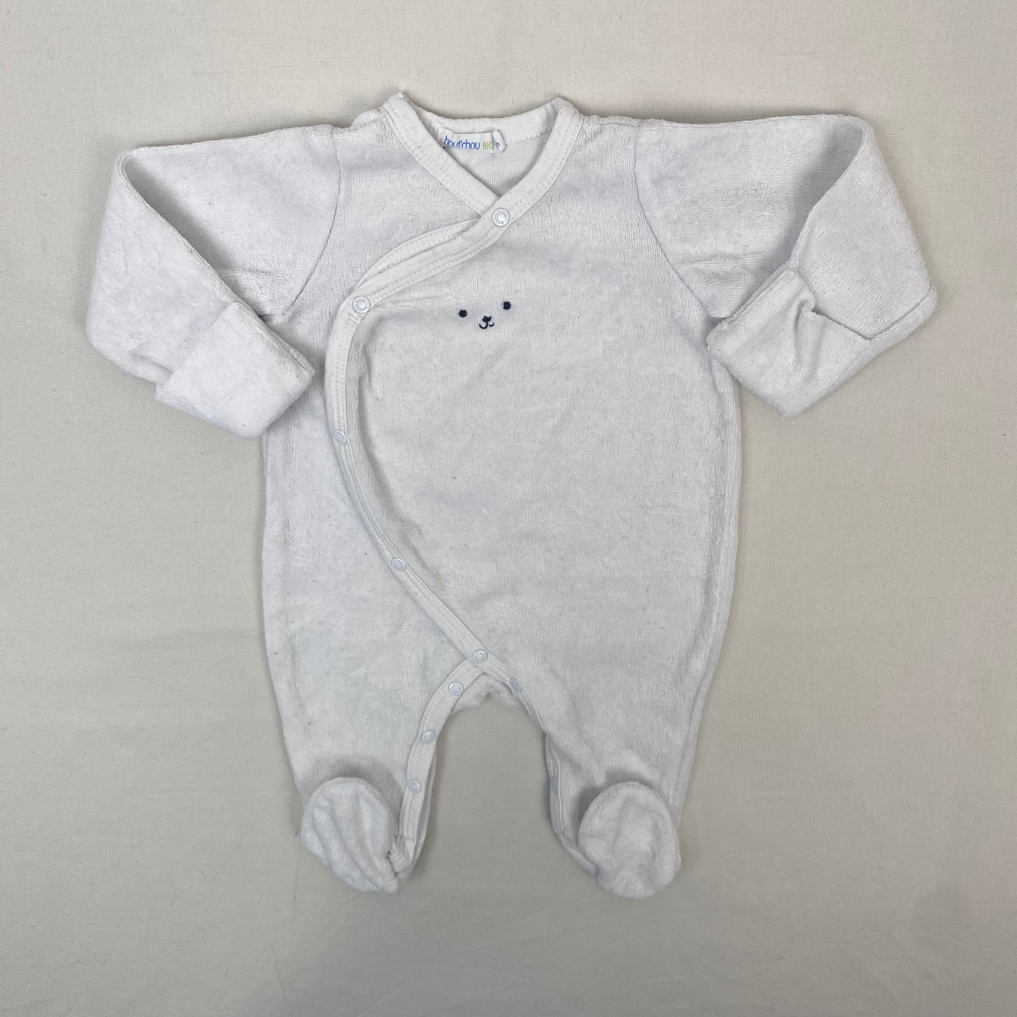 Autres commentaires : 23% polyester. Pyjama dors-bien en velours blanc avec un visage d’ours à l’avant, fermeture croisée par boutons pression.