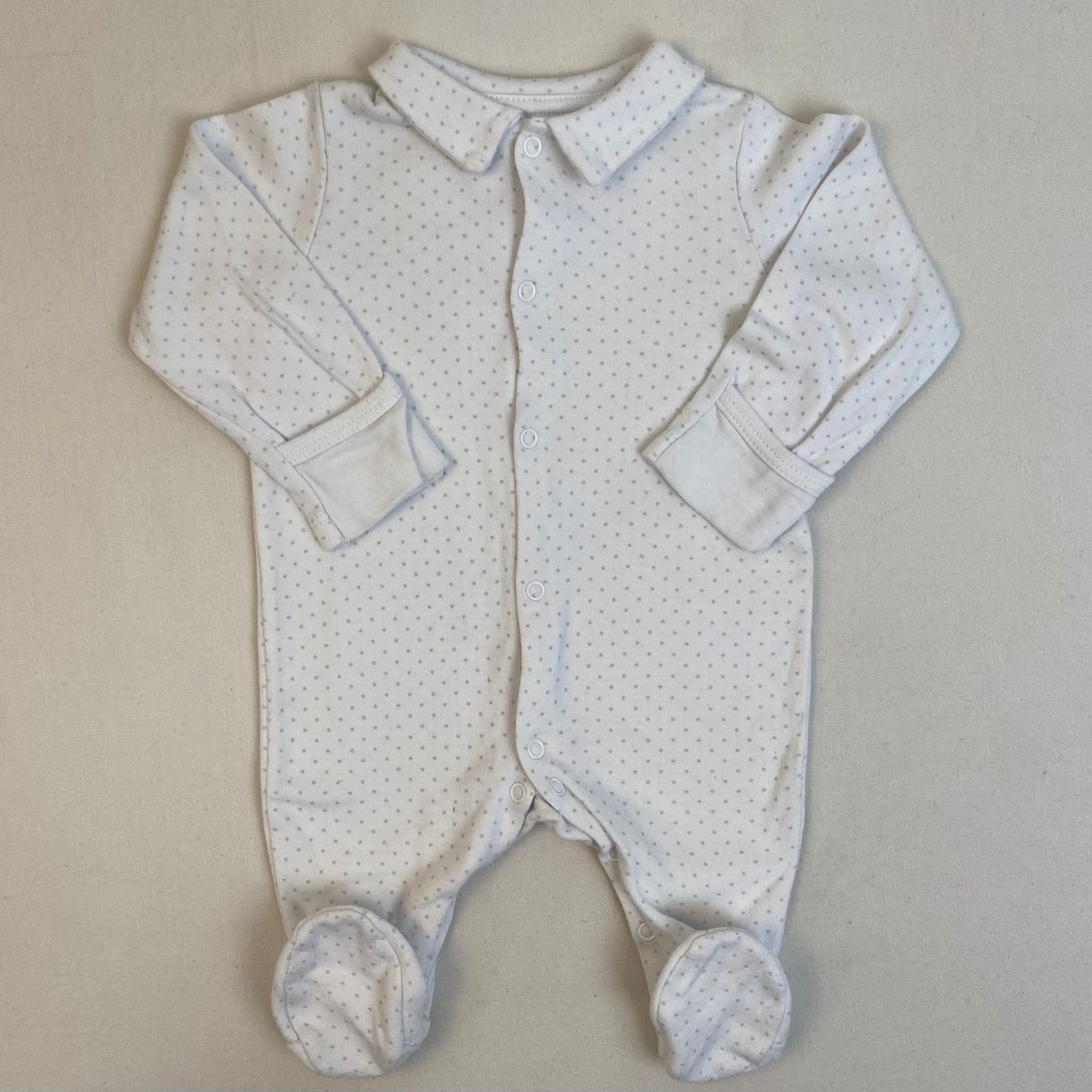 Pyjama blanc à pois gris, col chemise, fermeture par boutons pression devant et à l’entrejambe.
