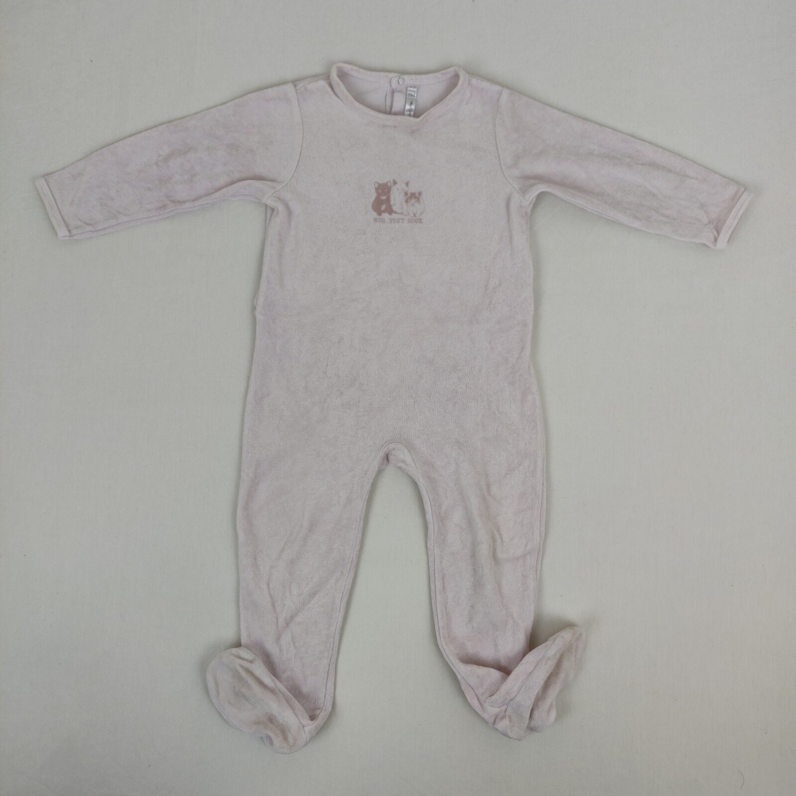 Autres commentaires : 23% polyester. Pyjama une piéce manches longues rose en velours, col rose avec une fermeture au dos par boutons pressions.