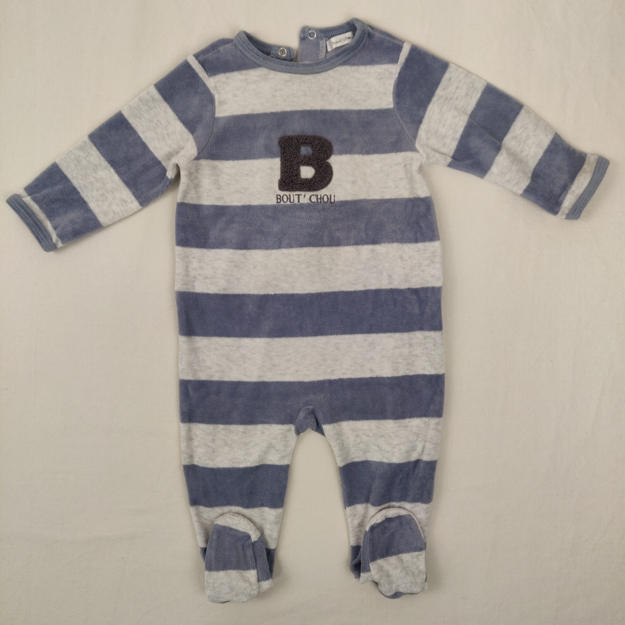 Autres commentaires : Pyjama dors-bien en velours blanc à rayures grises, fermeture par boutons pression au dos (le bouton du haut ne ferme pas), devant inscription « B .Bout’chou ».