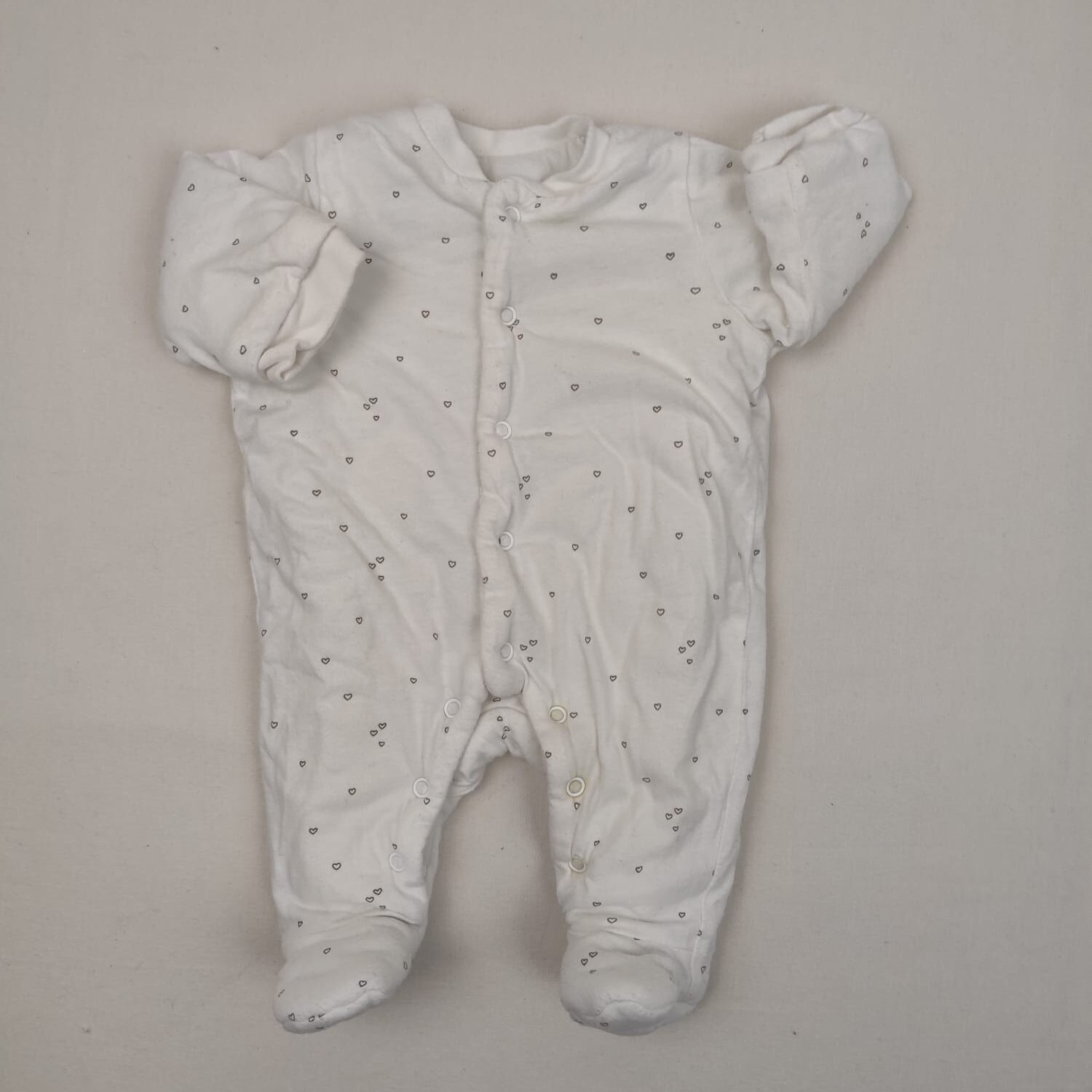 Autres commentaires : Sur-pyjama blanc chaud en coton avec pieds, motif mini coeurs noir, doublure coton 100% et garnissage polyester 100%, fermeture par boutons pression à l’avant. Petit défaut : un peu jauni au niveau de l’entrejambe gauche. Niveau réduit de Fraise à Myrtille.