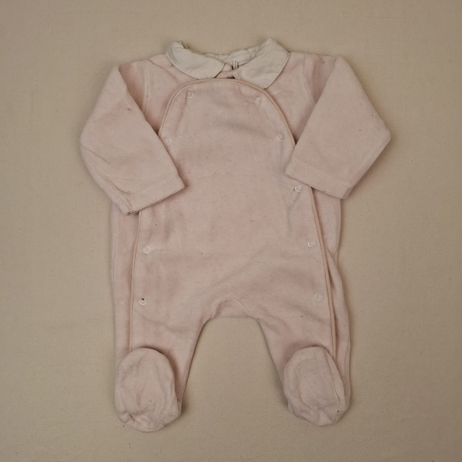 Autres commentaires : Pyjama en velours rose clair, fermeture par boutons pression à l’avant, col Claudine blanc.