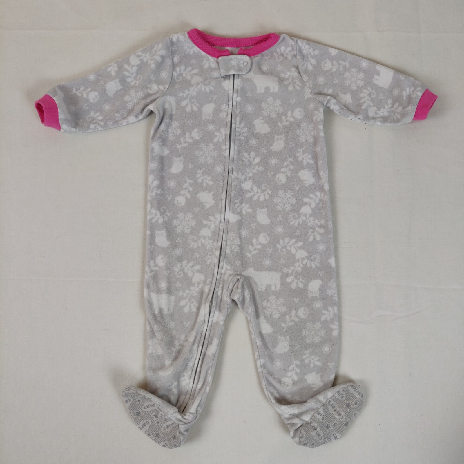 Autres commentaires : Pyjama 1 pièce à manches longues et à pieds en polaire – gris avec motifs blancs d’hiver. Semelles antidérapantes. Le col et les poignets façon tricot élastique rose. Ouverture cenrale à zip et à un bouton pression. Usure normale du vêtement.