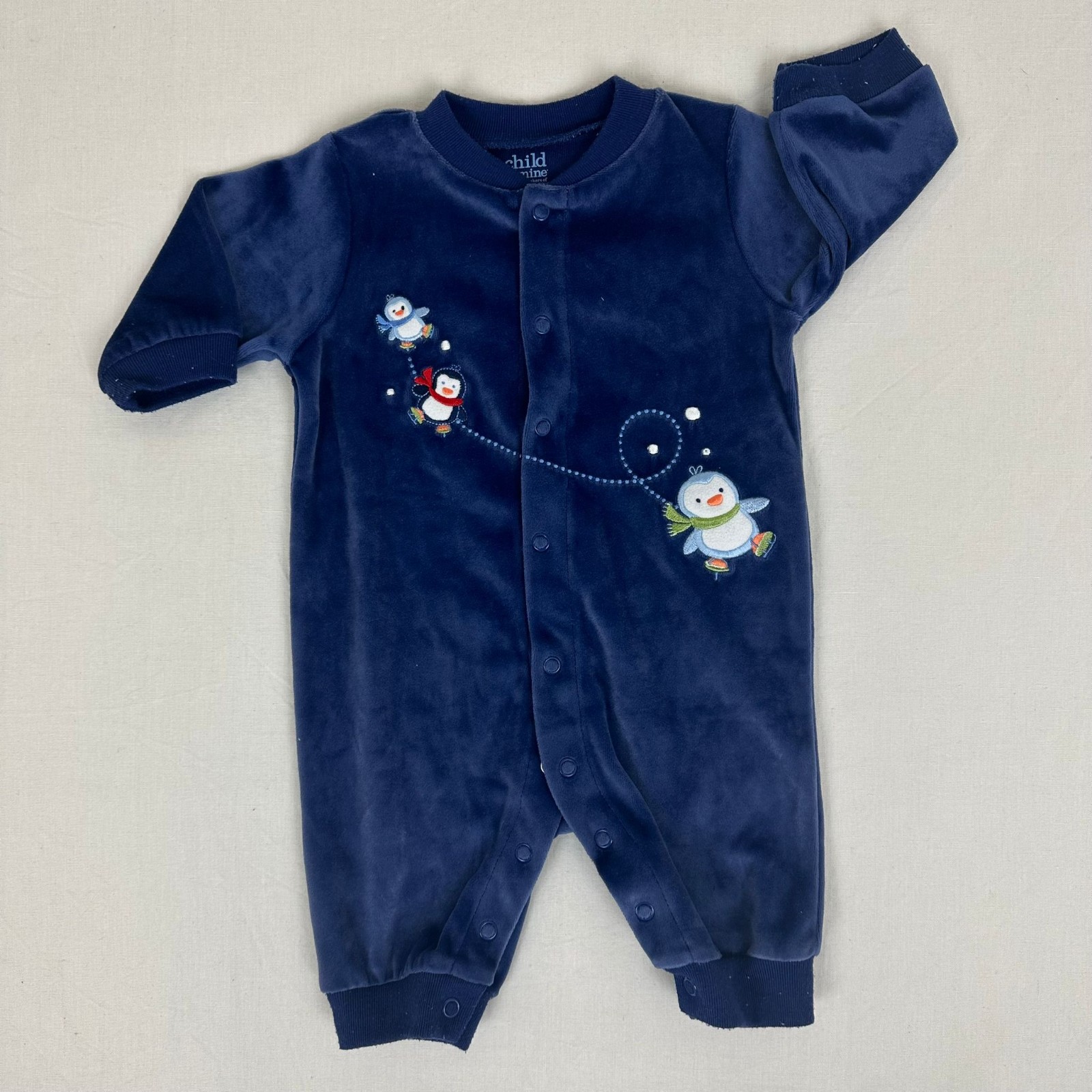 Autres commentaires : Pyjama une piéce bleu foncé en velours avec motif pinguin et une fermeture par boutons pressions devant.