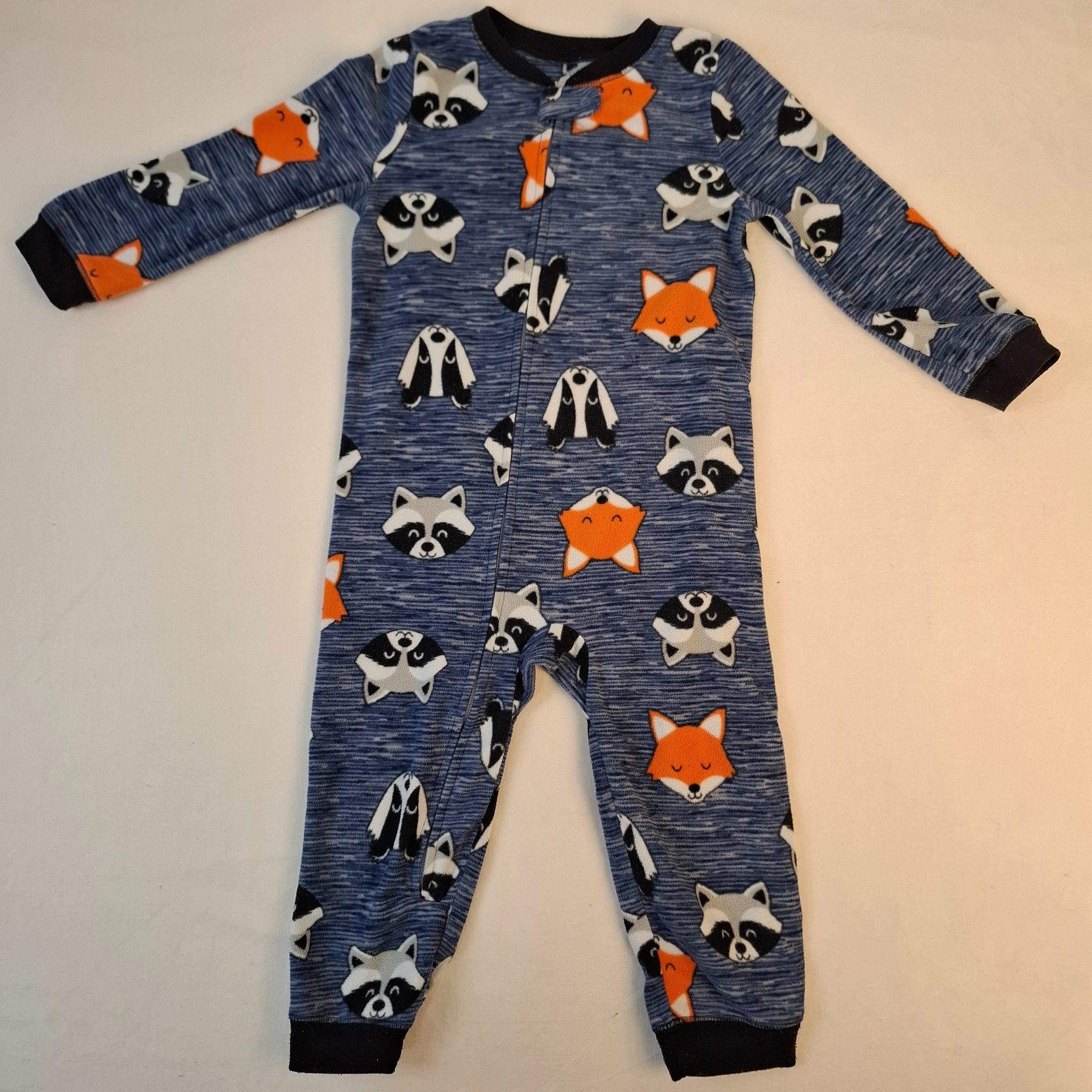 - Pyjama 1 pièce bleu avec des dessins de renard et de raton laveur. Femeture éclair ZIP à l’avant sur tout le long du corp.