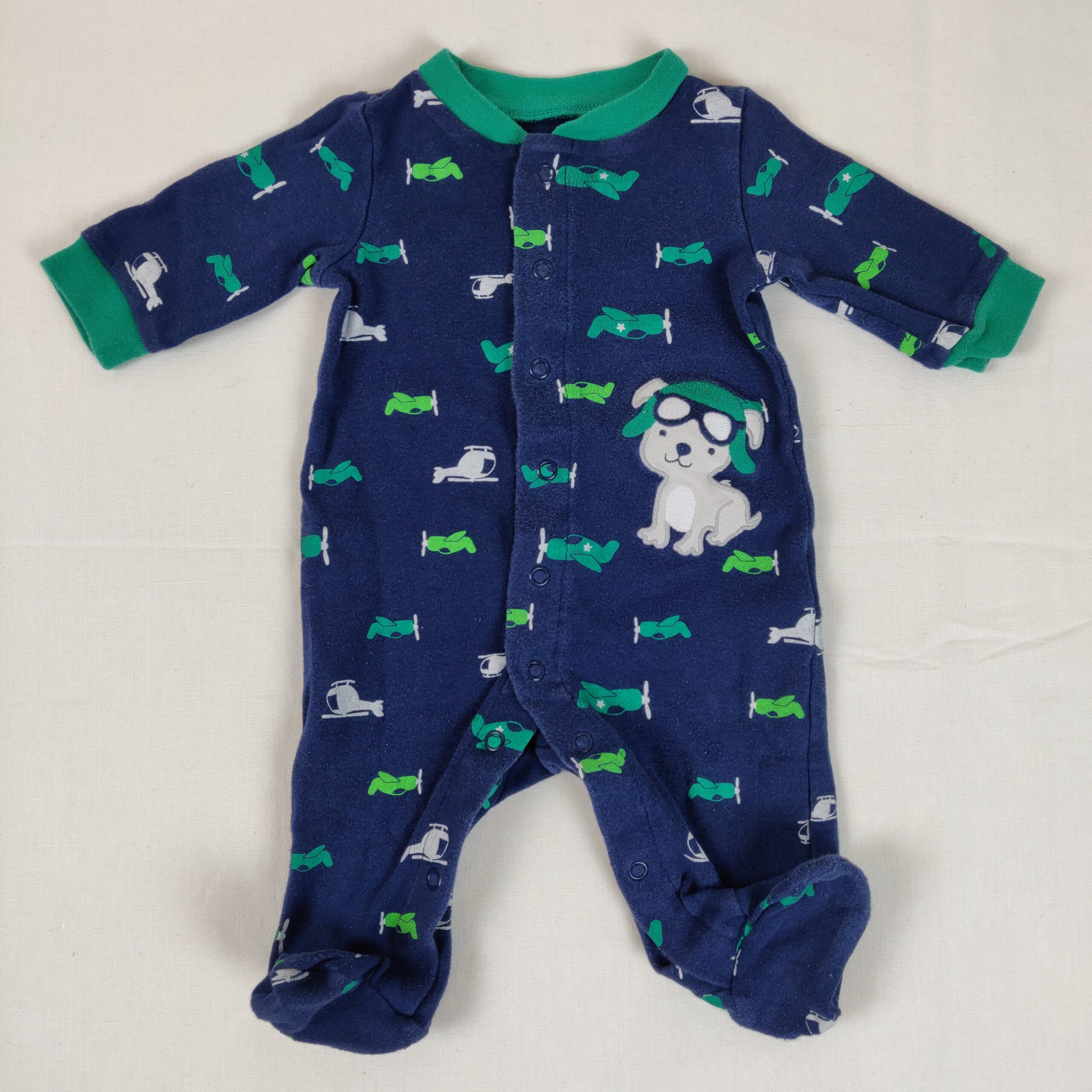 Autres commentaires : Pyjama 1 pièce à manches longues et à pieds – bleu marine avec motifs avions et hélicoptères verts et blancs. Motif central piqué chien aviateur. Ouverture centrale à boutons pression. Usure normale du vêtement.