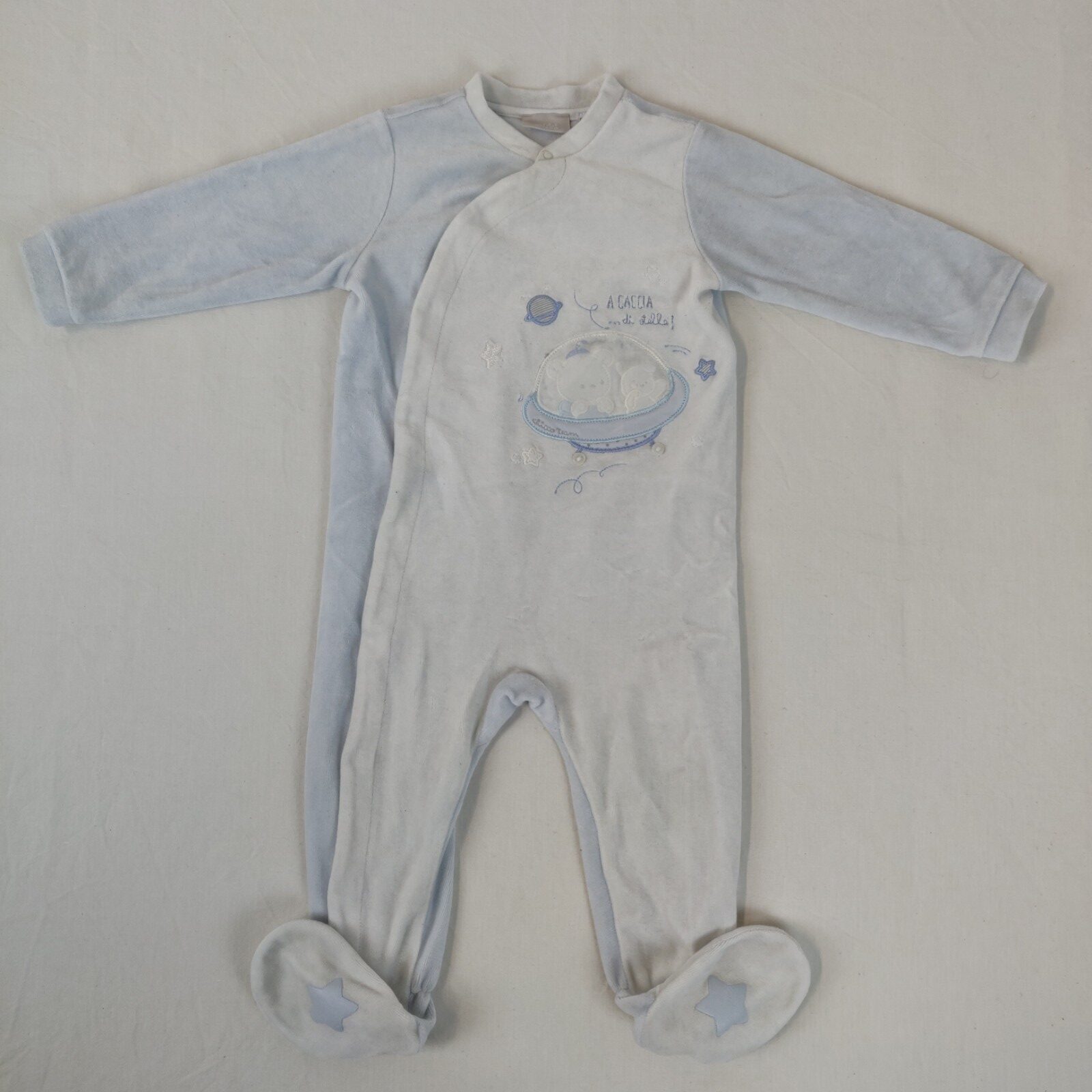 Autres commentaires : 25% polyester. Pyjama 1 pièce DORS-BIEN à manches longues et à pieds en velours bleu clair et blanc. Motif central ousons dans une soucoupe volante. Ouverture pressionnée latérale.