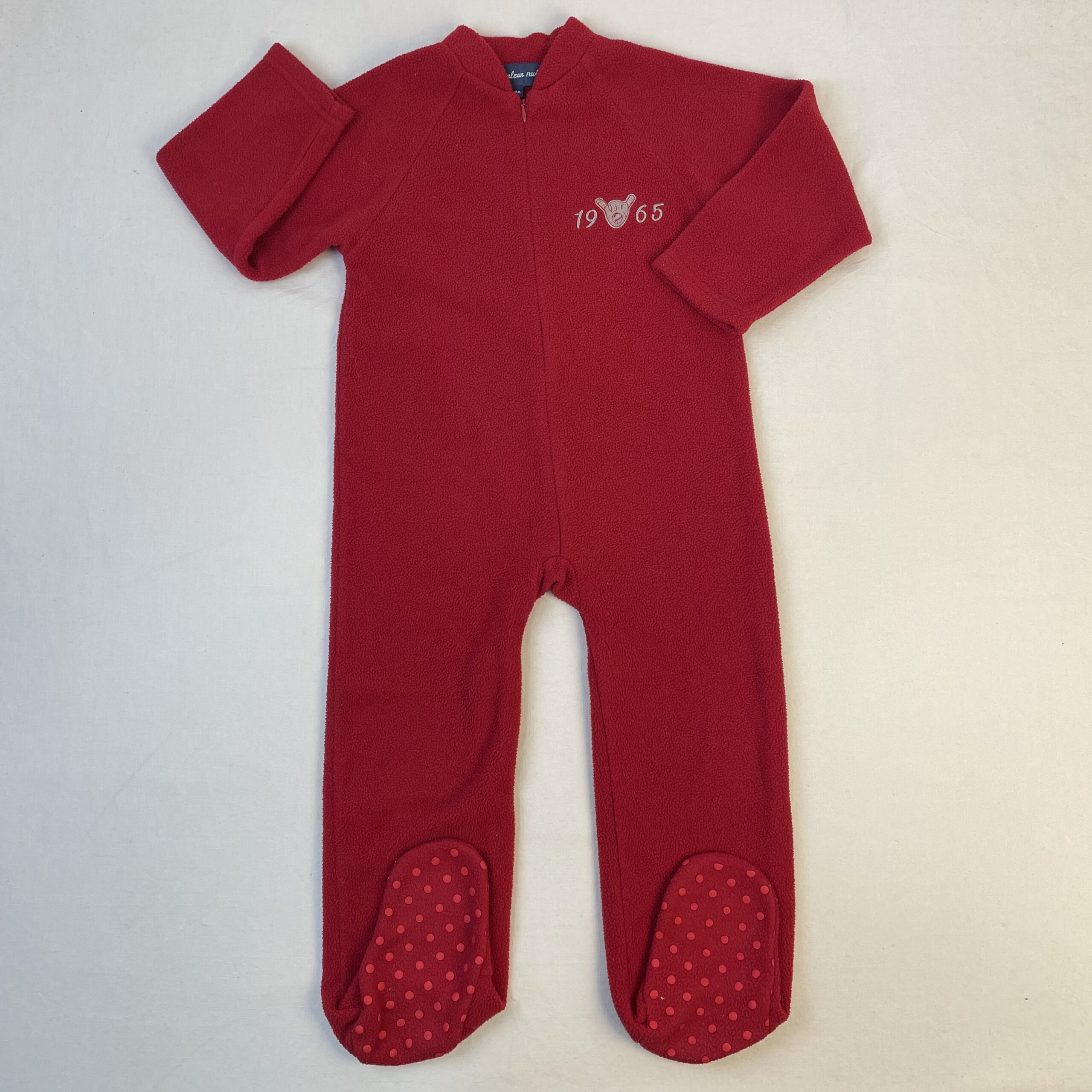 - Sur pyjama 1 pièce en polaire rouge, dessous-de-pieds anti-dérapants, fermeture devant par zip, devant inscription brodée « 1965 » en beige brillant avec un mini gant de base ball au milieu.