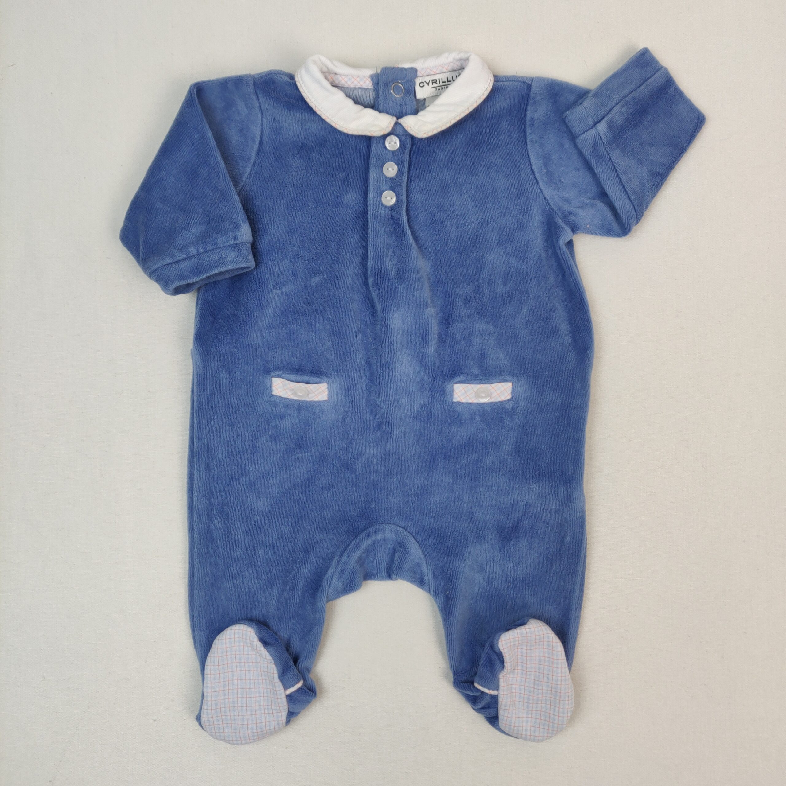 Autres commentaires : 25% Polyester, Pyjama dors-bien en velours bleu avec pieds, col claudine blanc avec 3 boutons à l’encolure, fermeture par boutons pression à l’arrière.