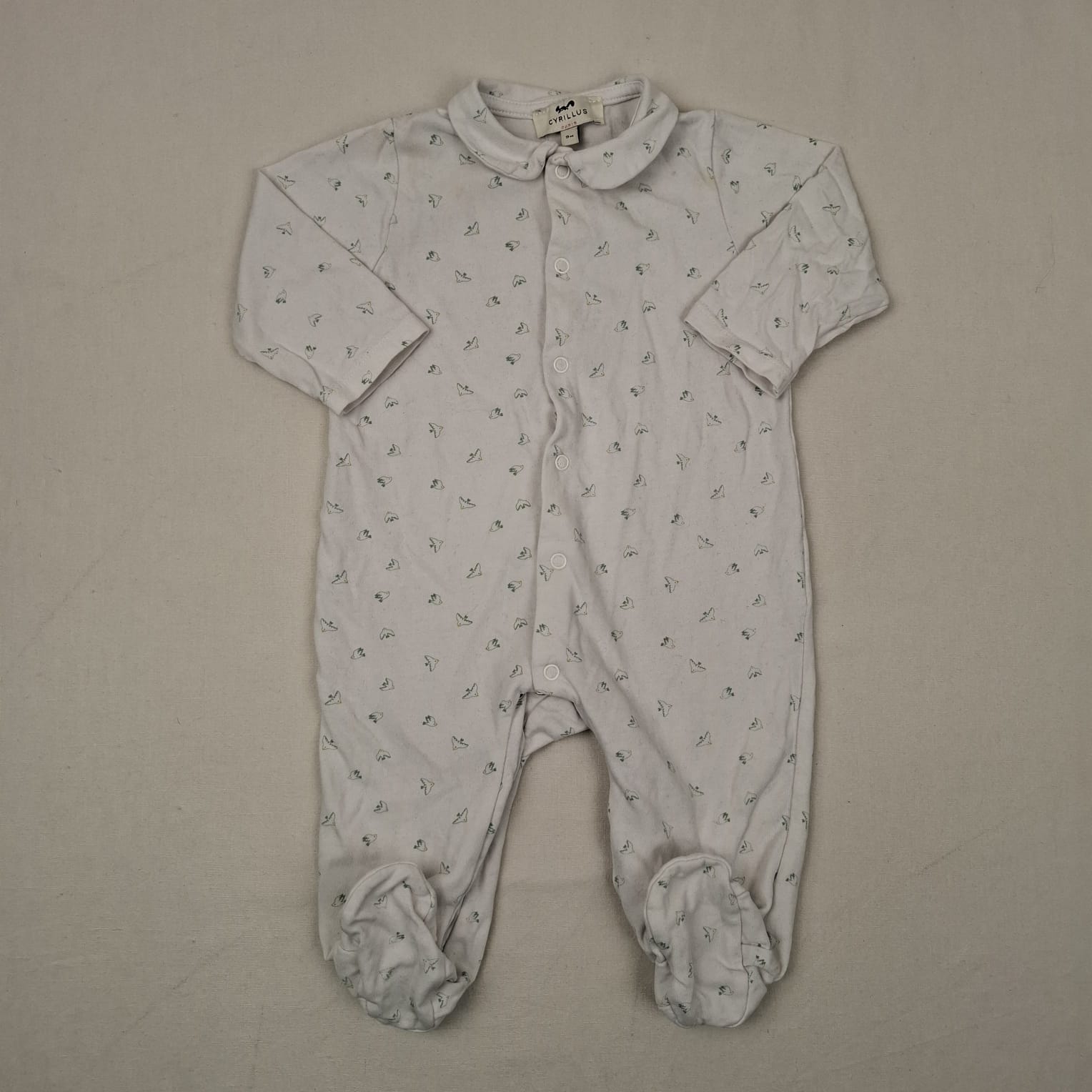 Autres commentaires : Pyjama blanche, col Claudine, fermeture par bouton de pression à l’avant, motif des oiseaux, une petite tâche à l’avant.