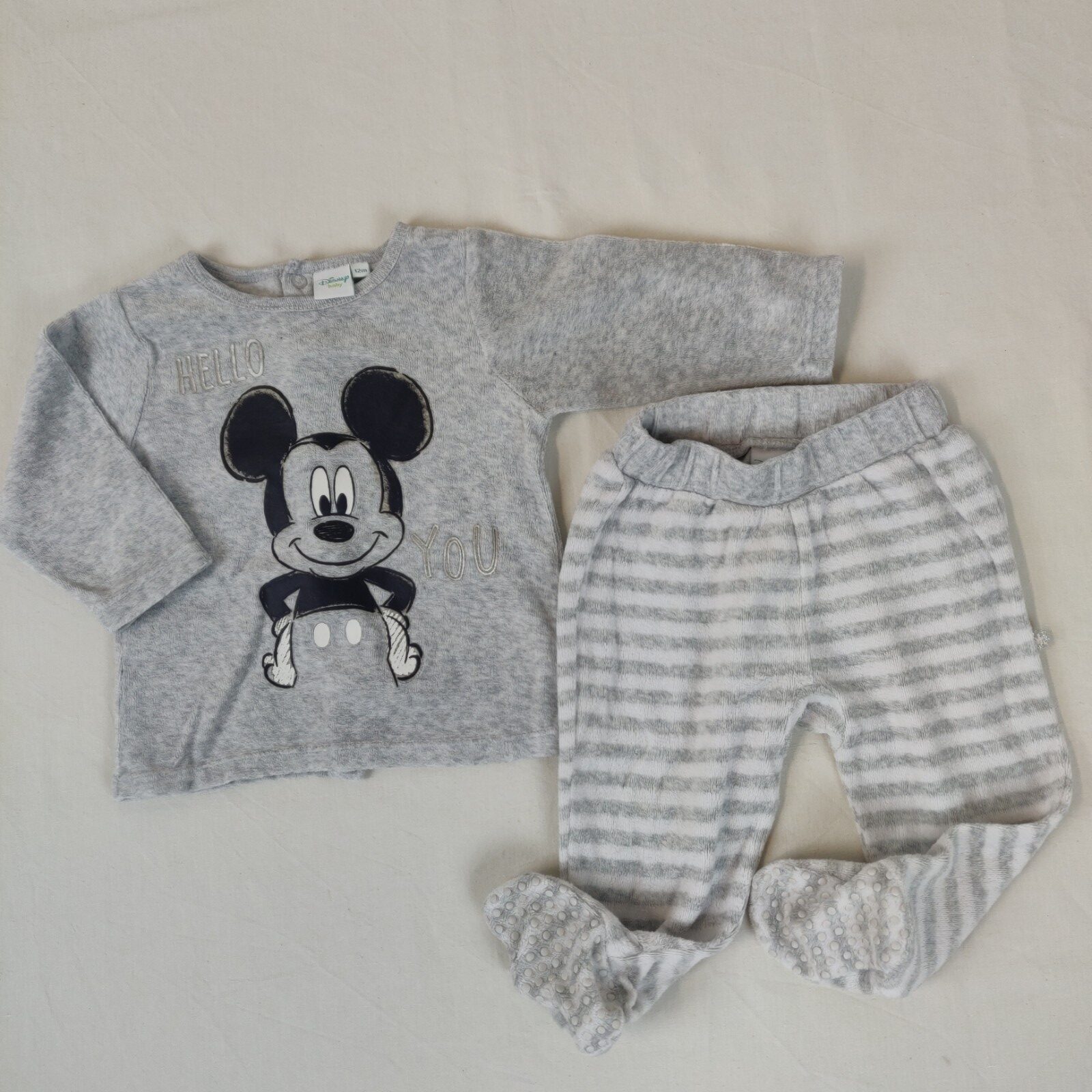 Autres commentaires : 24 polyester. Pyjama 2 pièces en velours – gris chiné. Haut à manches longues. Motif central Mickey accompagné de l’inscription « Hello you ». Ouverture centrale au dos à pressions. Pantalon blanc rayé gris à pieds. Taille élastique. Semelles antidérapantes. Usure normale.