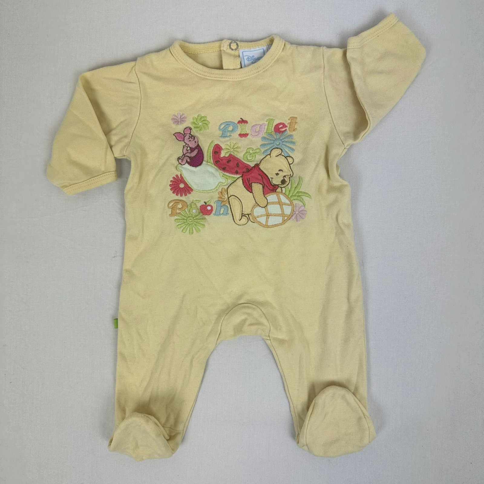 Autres commentaires : Pyjama jaune une piéce manches longues avec motif Piglet Pooh avec une fermeture par boutons pressions au dos.