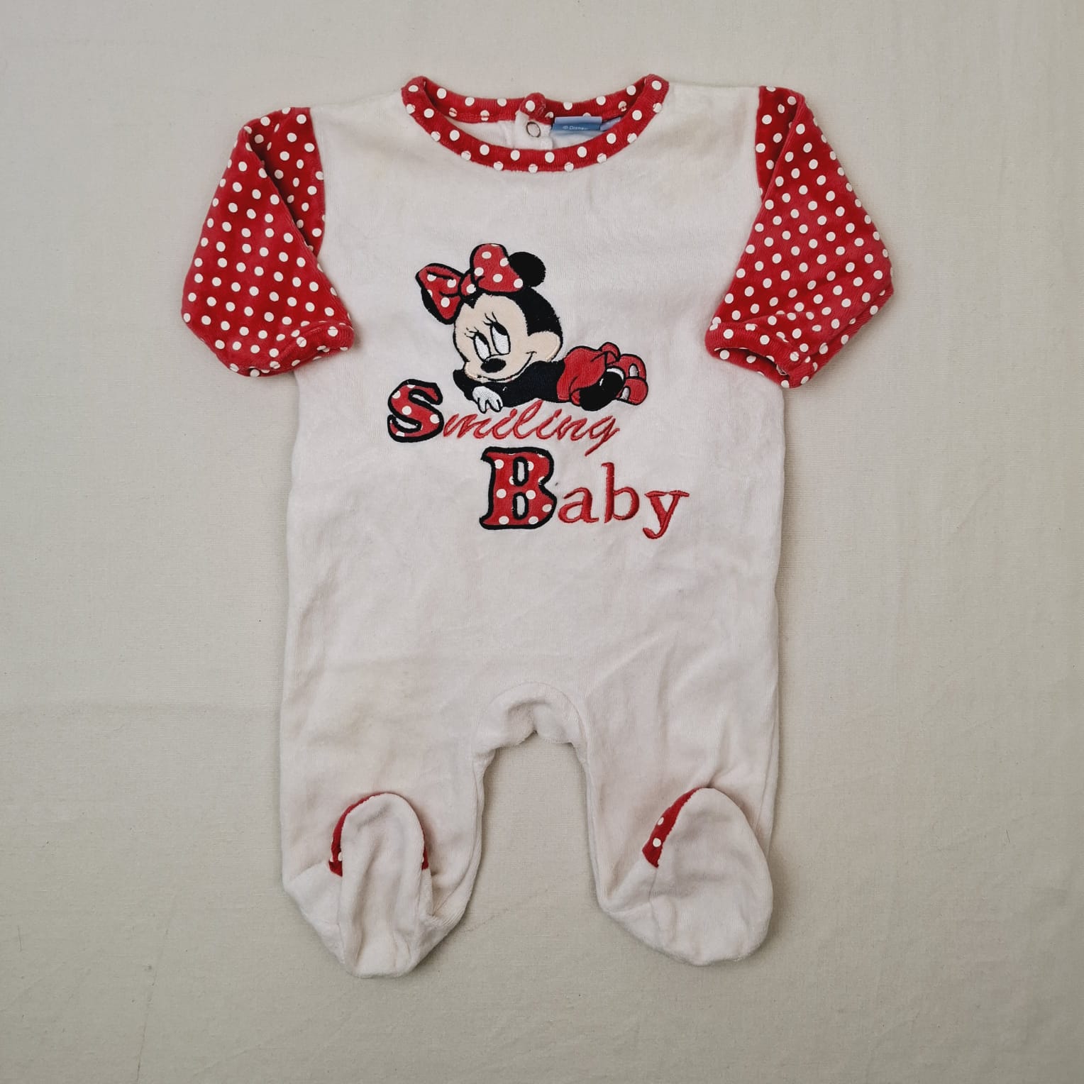 Autres commentaires : Pyjama en velours blanc, manches longues rouges à pois blancs, col rond, fermeture par boutons pression au dos, motif Minnie Mouse et inscription « Smiling Baby », 25% polyester.