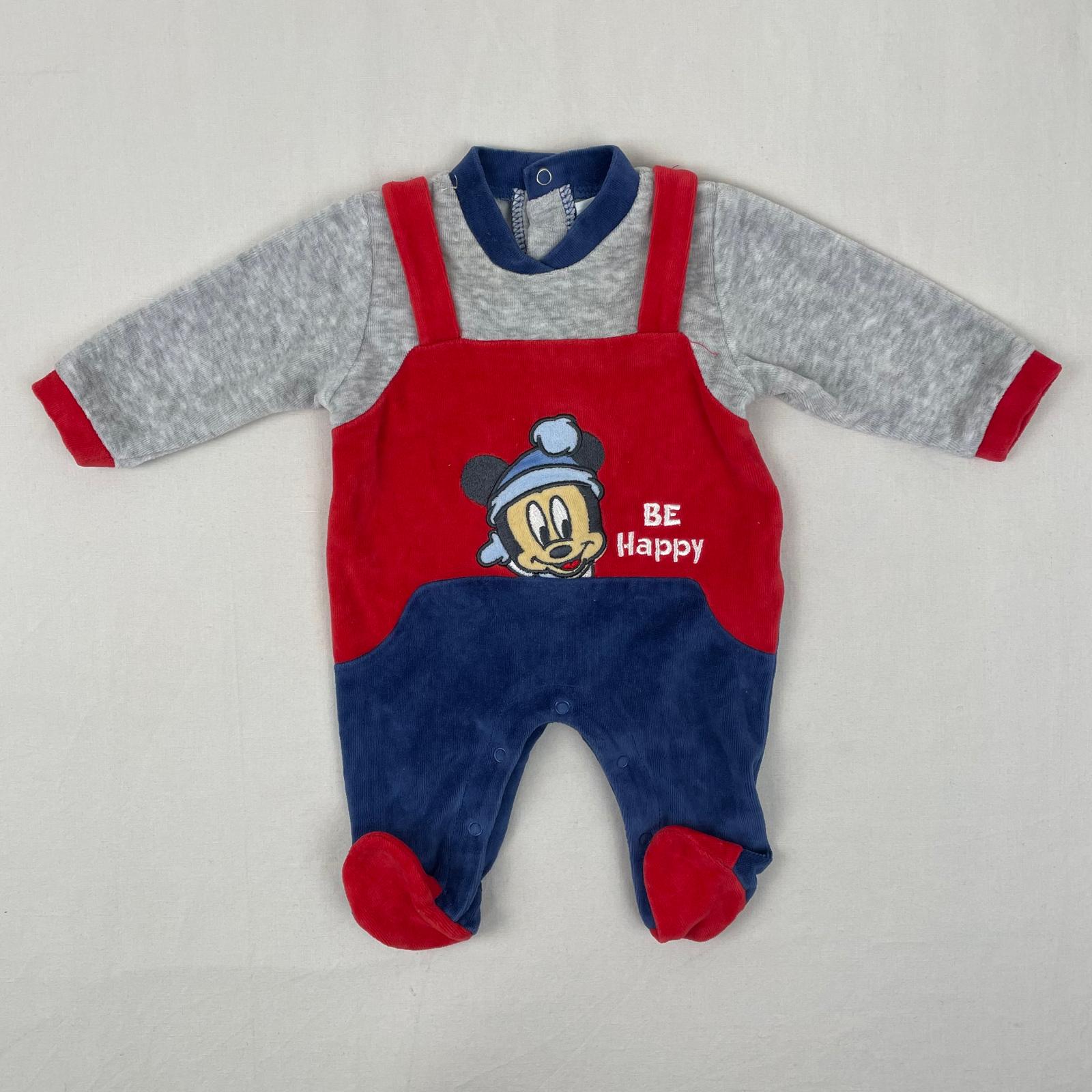 Autres commentaires : 25% polyester. Pyjama en velours avec pieds, manches longues. Colorblock gris, rouge et bleu, tête de mickey avec un bonnet de nuit, inscription « Be happy », effet de double couche avec des bretelles. Boutons pression derrière et à l’entrejambe. Chevilles élastiquées.