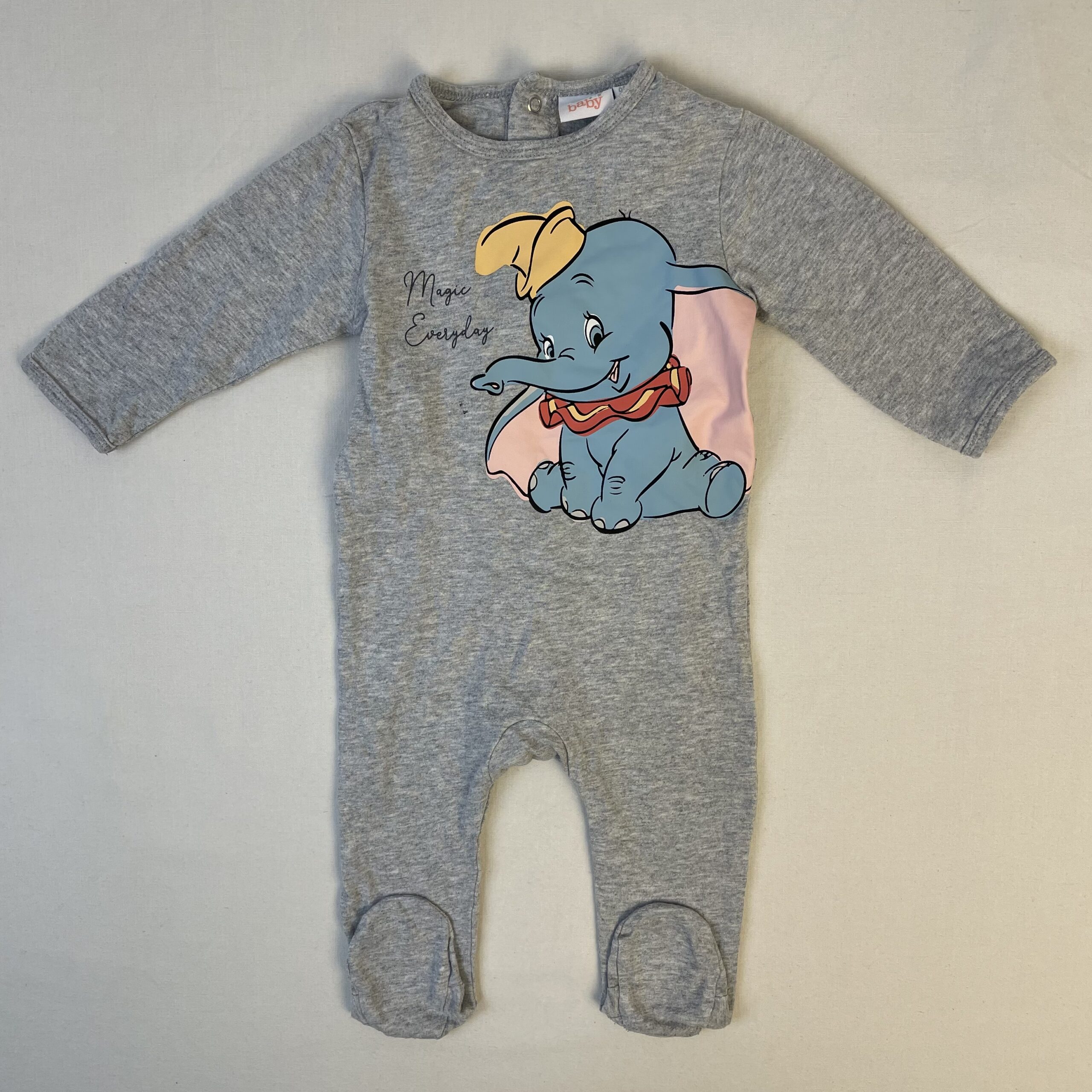 - Pyjama gris clair avec pieds, fermeture par boutons pression au dos, motif éléphant et inscription « Magic everyday ». Un peu de peluches au toucher.