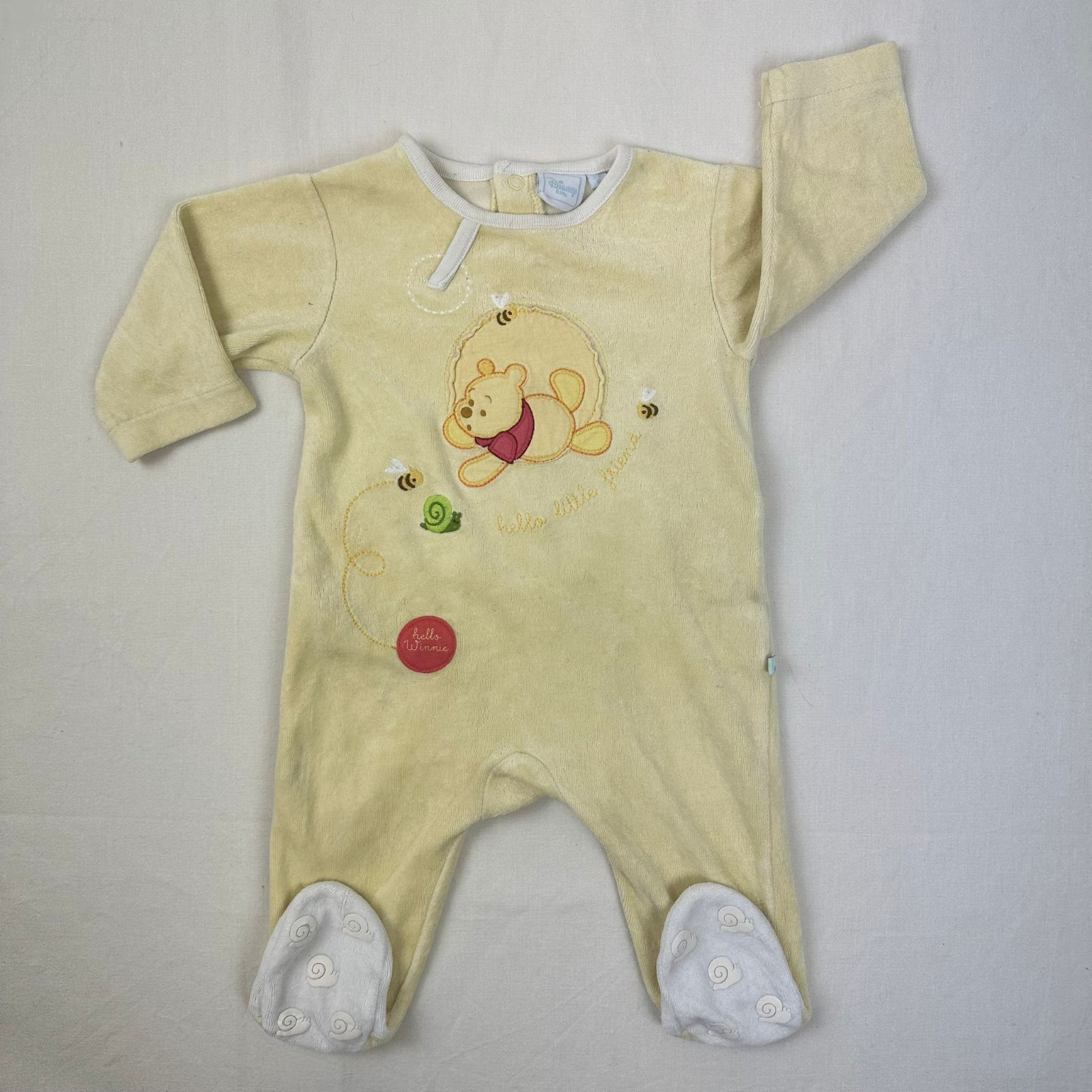 Autres commentaires : 24% polyester. Combinaison longue jaune en velours avec une fermeture dérrière par boutons pressions et motif Winnie the Pooh.