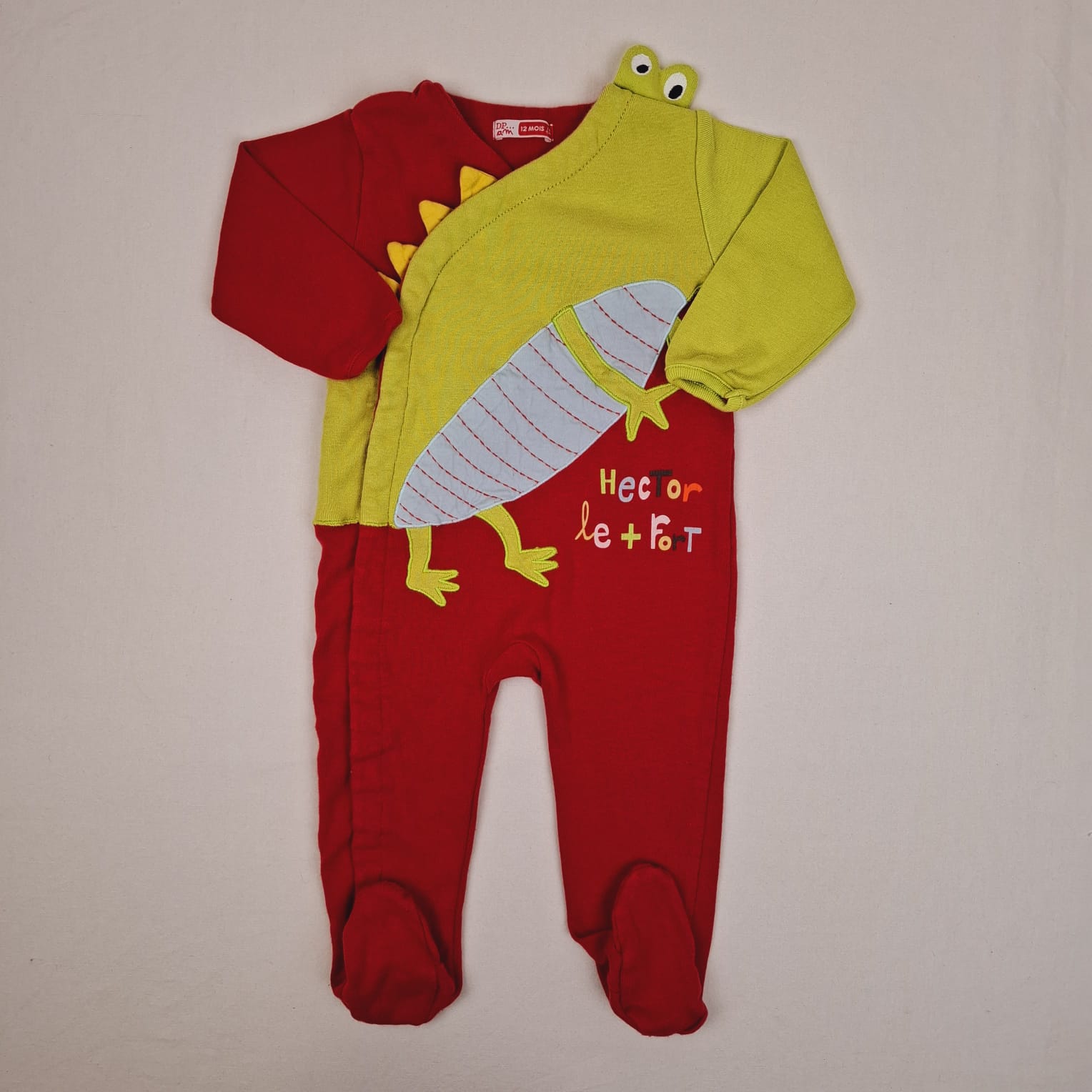 Autres commentaires : Pyjama 1 pièce DPAM rouge 12M avec pieds intégré , et poignets élastiquée , boutons pressions de fermeture à l’avant , avec motifs de dragon vert