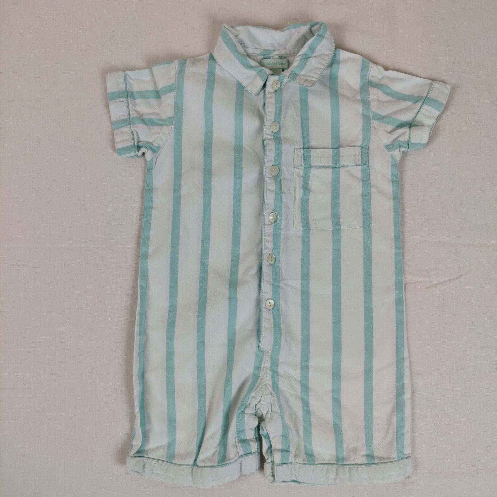 Autres commentaires : Pyjama 1 pièce à manches et jambes courtes – blanc avec fines rayures turquoises verticales. Ouverture centrale chemise à boutons classiques nacrés. Col chemise. Pochette centrale. Léger effet pelucheux.