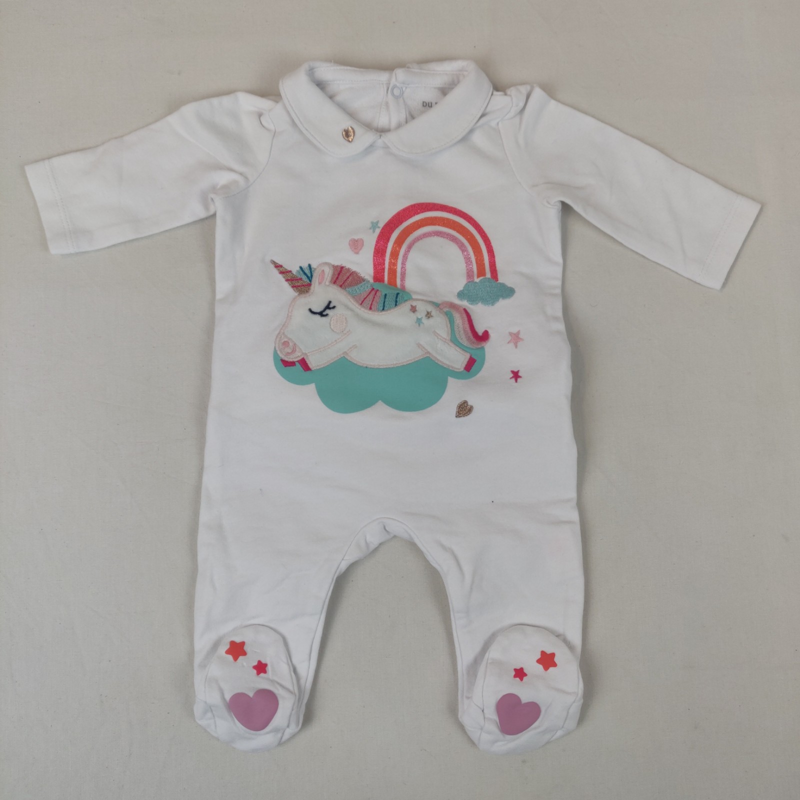 Autres commentaires : Pyjama blanc avec licorne multicolore et fermeture à boutons pression au dos.