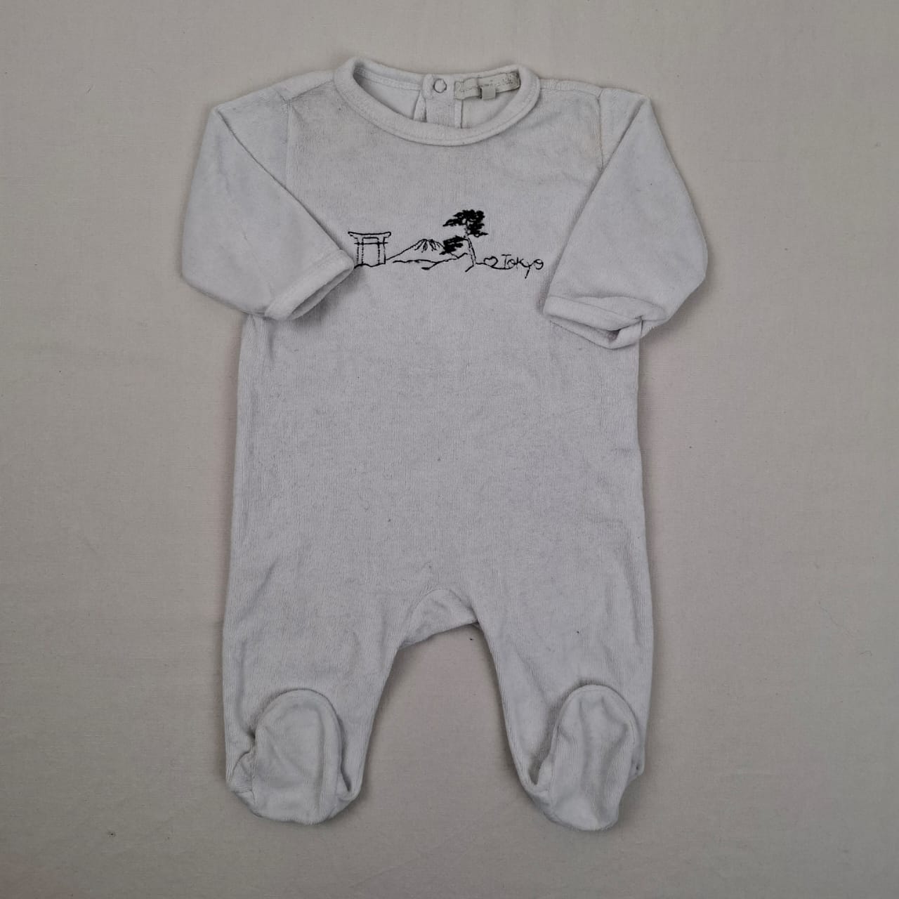 Autres commentaires : Pyjama dors-bien en velours bleu clair DPAM, fermeture par boutons pression au dos, sur le devant illustration de paysage japonais avec inscription de TOKYO.