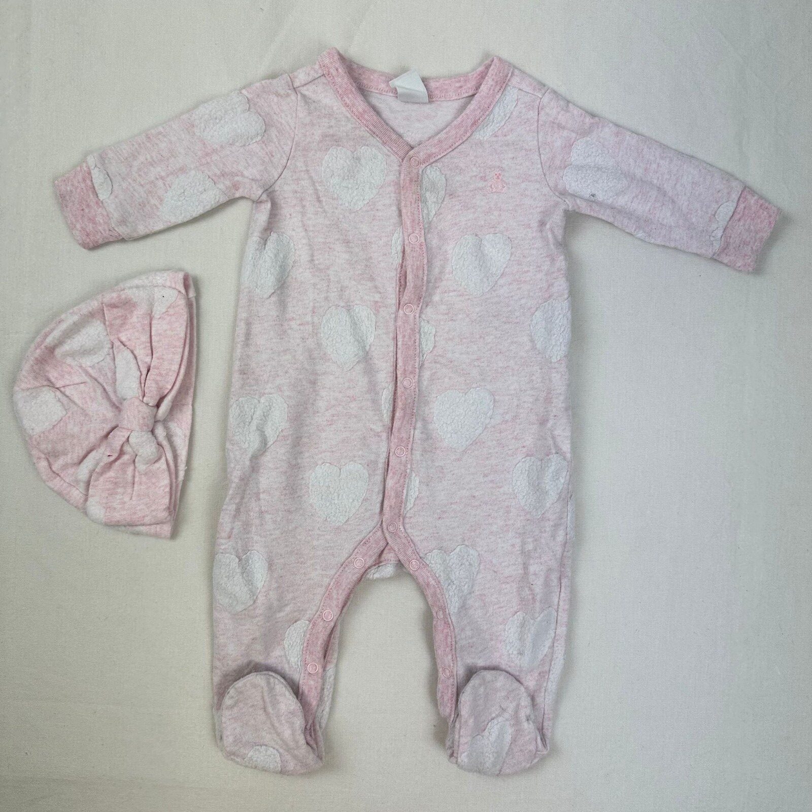 Autres commentaires : Pyjama une piéce rose avec motif des coeurs blanc avec une fermeture devant par boutons pressions. Accompagné d’un petit bonnet avec noeuds.