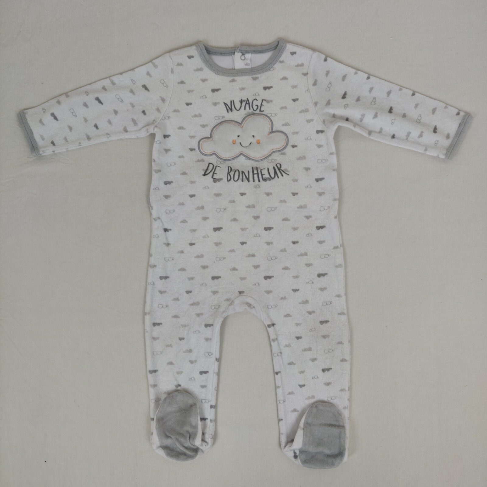 Autres commentaires : 47% polyester.Pyjama une piéce en velours manches longues blanc et gris, col rond avec une fermeture au dos par boutons pressions et comme motif des petites nuages gris.
