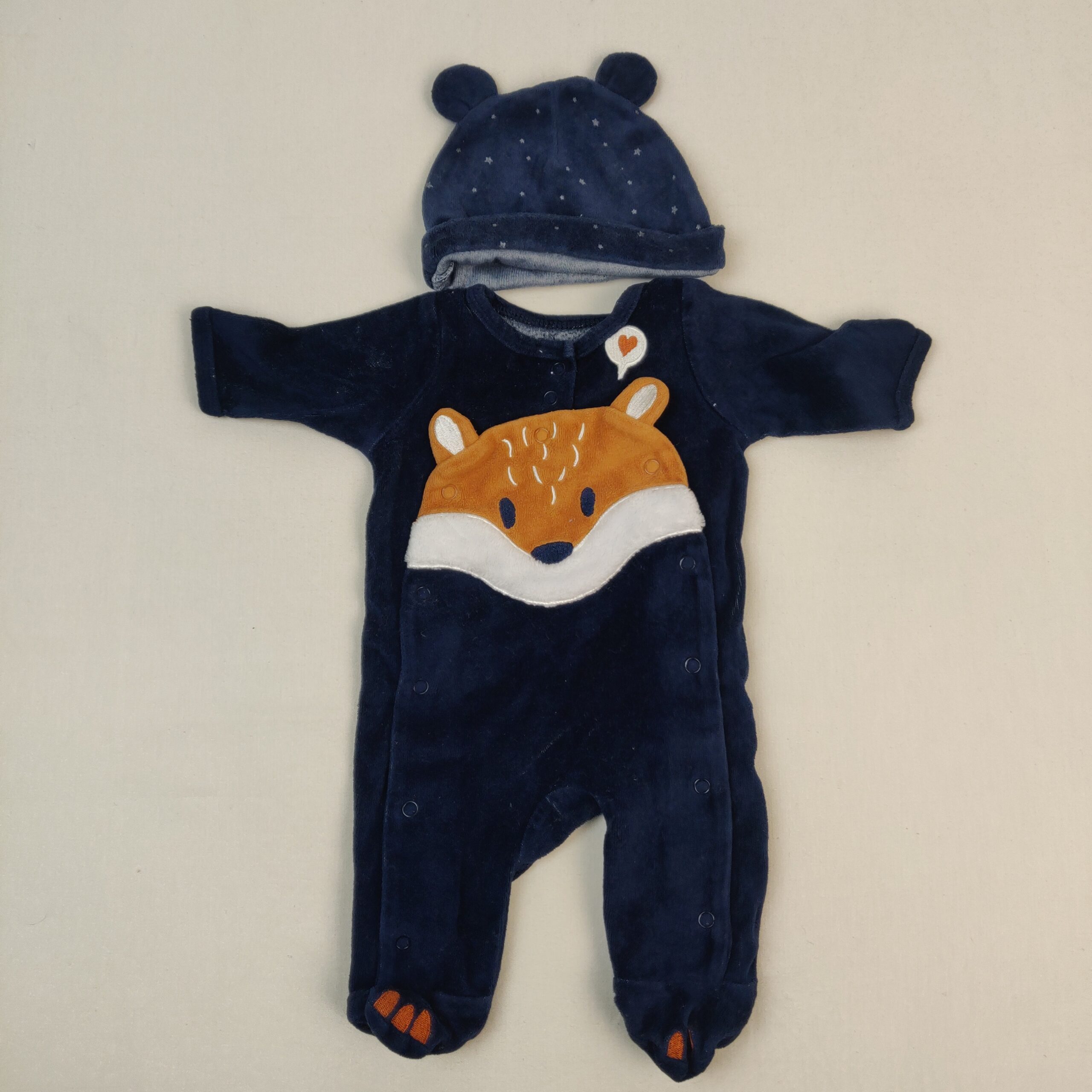 Autres commentaires : Pyjama dors-bien en velours avec pieds bleu foncé, trés bon état, motif renard, fermeture double par boutons pression à l’avant. Bonnet offert, en velours bleu foncé In extenso, motifs petits etoiles, petites oreilles au dessus du bonnet, taille 62 cm.